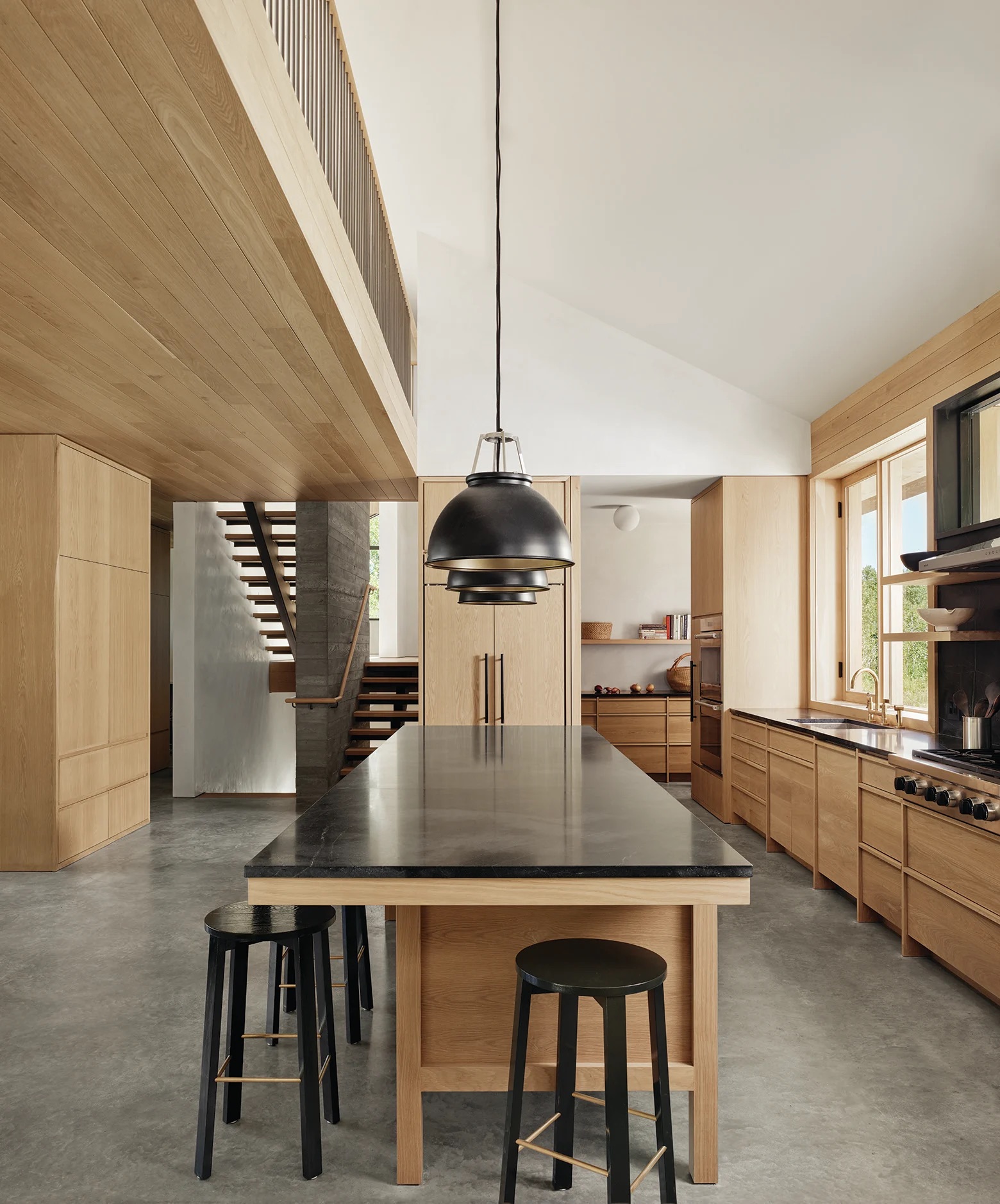 The kitchen employs a rich array of natural materials, including solid oak cabinetry, black soapstone and a polished concrete floor with radiant heat. | Photo: Casey Dunn