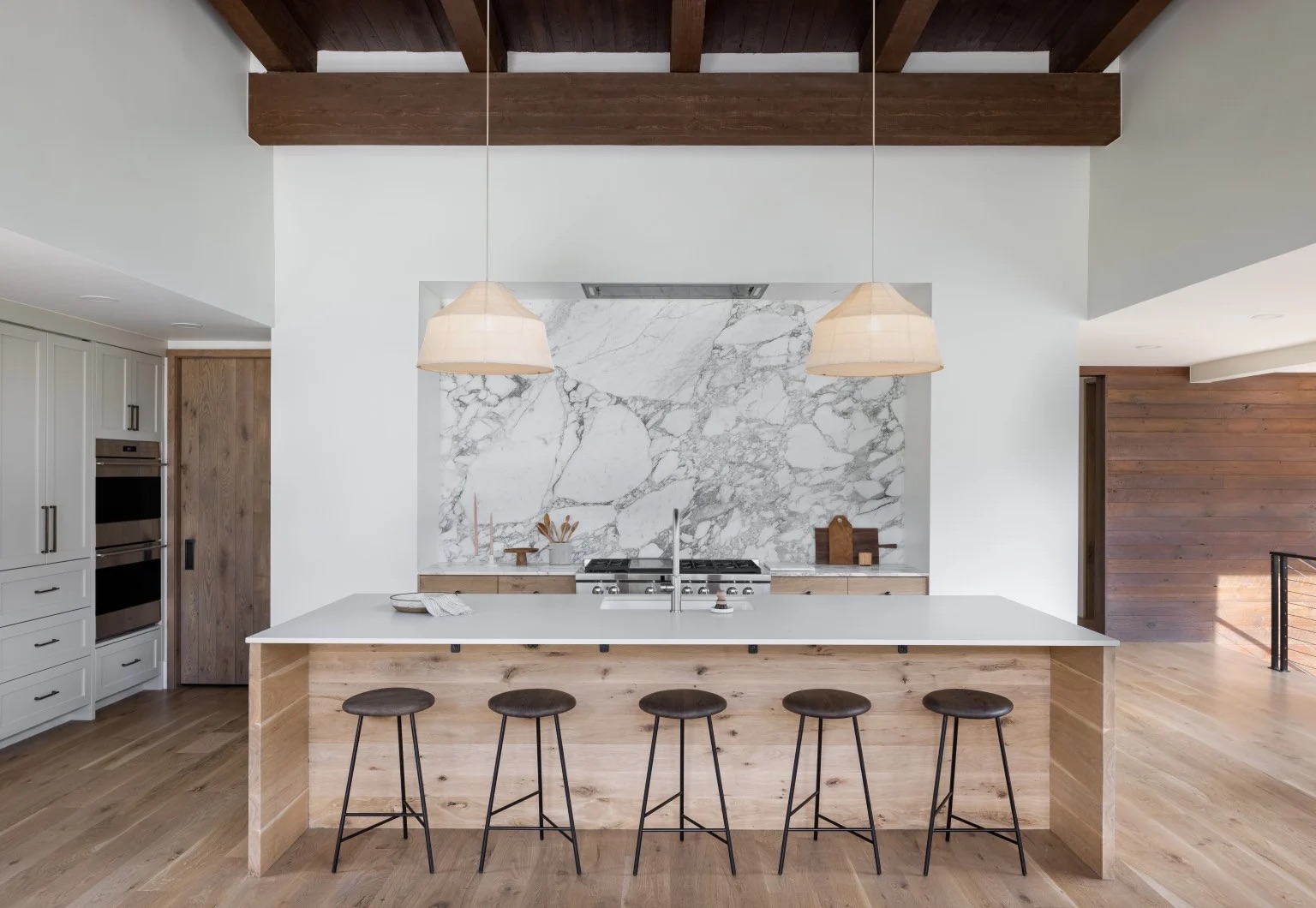 Accented by a mix of painted and white oak custom cabinetry, a graphic Calacatta Vagli Oro slab backsplash creates a beautiful counterpoint to the magnificent mountain vistas in this Sundance project by Lloyd Architects. | Photo: Melissa Kelsey