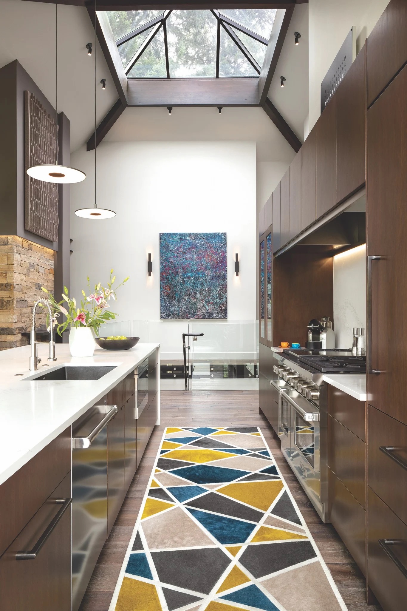 The kitchen gets a color boost from a Kyle Bunting hide rug and the Andrew Jensdotter painting on the far wall. | Photo: Kimberly Gavin