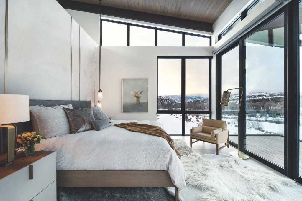 Wraparound windows offer restful vistas in the primary bedroom, where solar shades can be lowered for privacy and light control. The bed and night tables are from Restoration Hardware. | Photo: Gibeon Photography