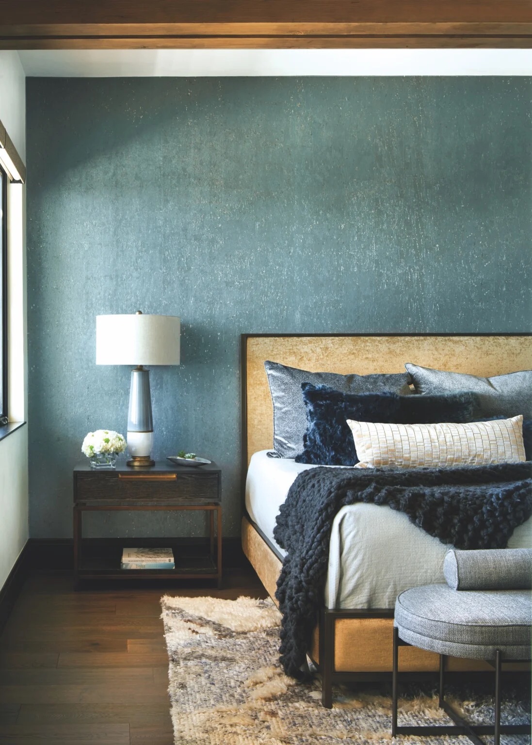 Metallic blue-gray cork wallcovering by Candice Olson for York Wallcoverings surrounds the primary bedroom in a calming embrace. | Photo: David Patterson