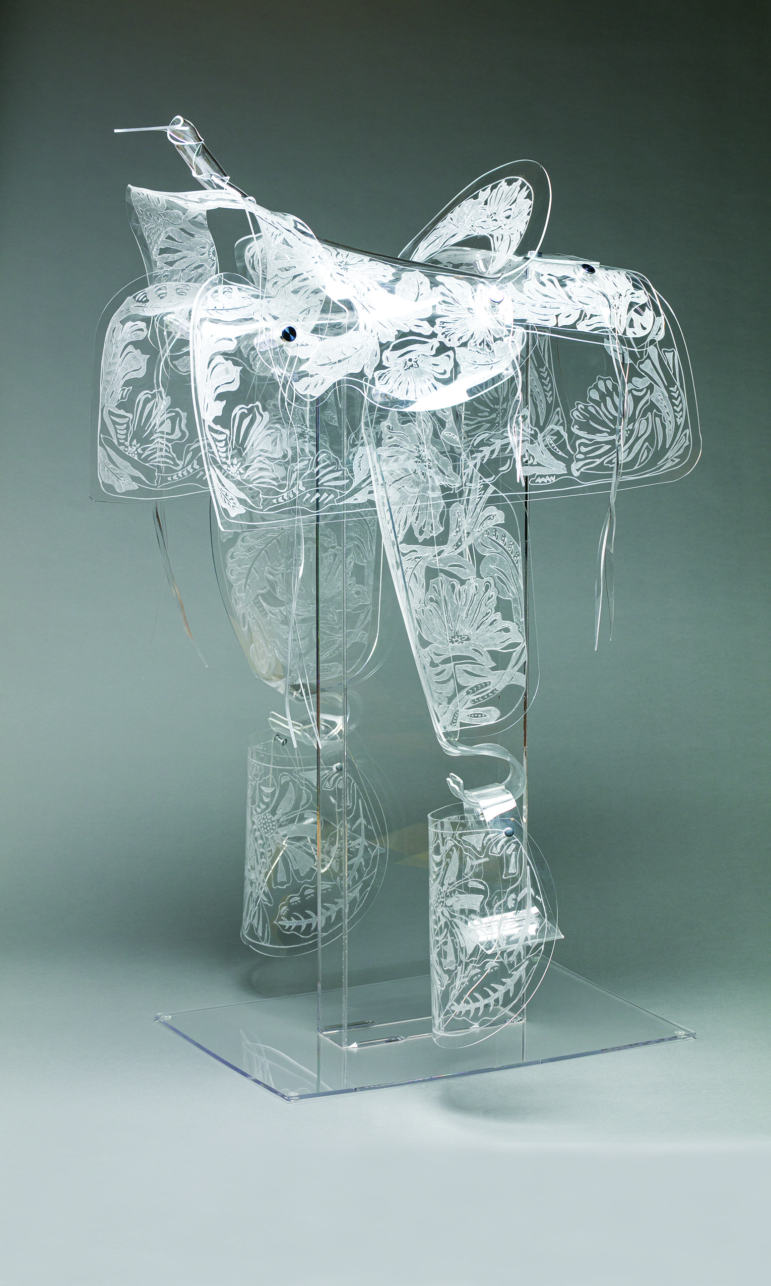 INTO SCULPTURE – “I made my own abstraction of a saddle pattern out of paper, and I went from there—starting with paper collage and then printing my imagery directly onto the acrylic, and then evolving into this sculptural collage. The etchings are my own, made-up kind of designs, but they’re all inspired by saddles: past saddles, and historic saddles with traditional leather tooling. I hope for that illusion effect, somewhat like magic, where you have to do a double-take. ‘Wait, is that glass? What material is this?’ It’s that element of surprise.”