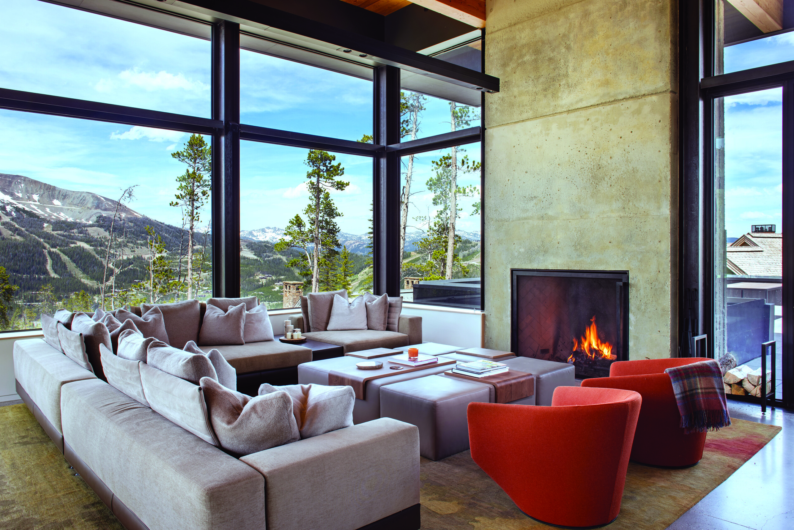 At its center is the main living pavilion, where a concrete fireplace anchors the great room, and several seating areas, a billiards table and a chef’s kitchen encourage connection. A glass elevator with an integrated beverage bar links to the lower-level game room and climbing wall—designed to keep the energy high long after the last run.