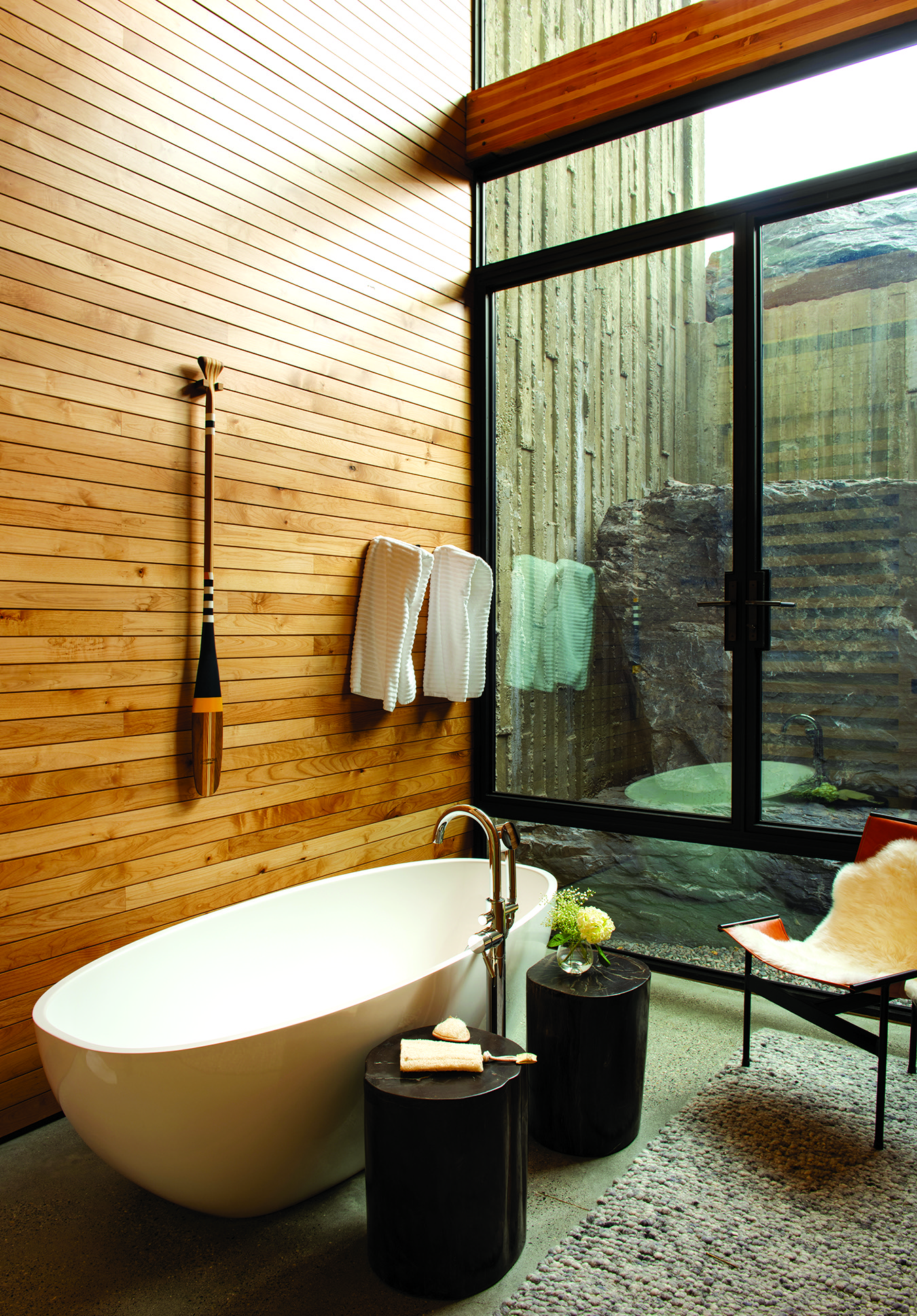 Among the home’s many innovative features is a concrete wall located along the great room that cantilevers out to support the balcony. “It was a challenging pour,” says Cobb, who credits Teton Heritage Builders with nailing the casting and texture. “They had to pour massive amounts of concrete that didn’t touch the ground, and they did an incredibly good job.”