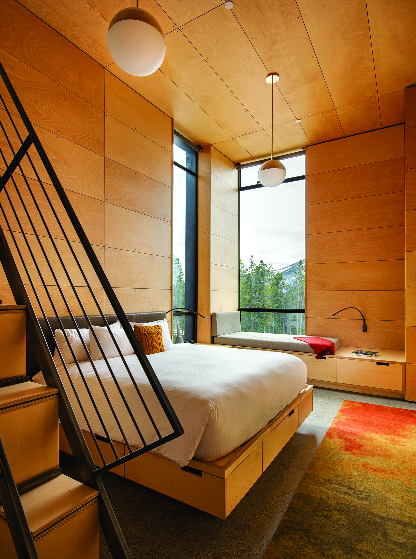 Sleeping quarters follow a nontraditional path. Instead of a dominant primary suite, the family opted for six flexible “micro cabins,” where Taylor maximized the square footage with bunks, lofts, built-ins and cleverly concealed storage. “We didn’t want one bedroom to feel more important than the rest,” explains the wife, noting the house is a joint venture with her husband’s sister and their father. “This is a house meant to be shared. We sleep somewhere different every visit.”