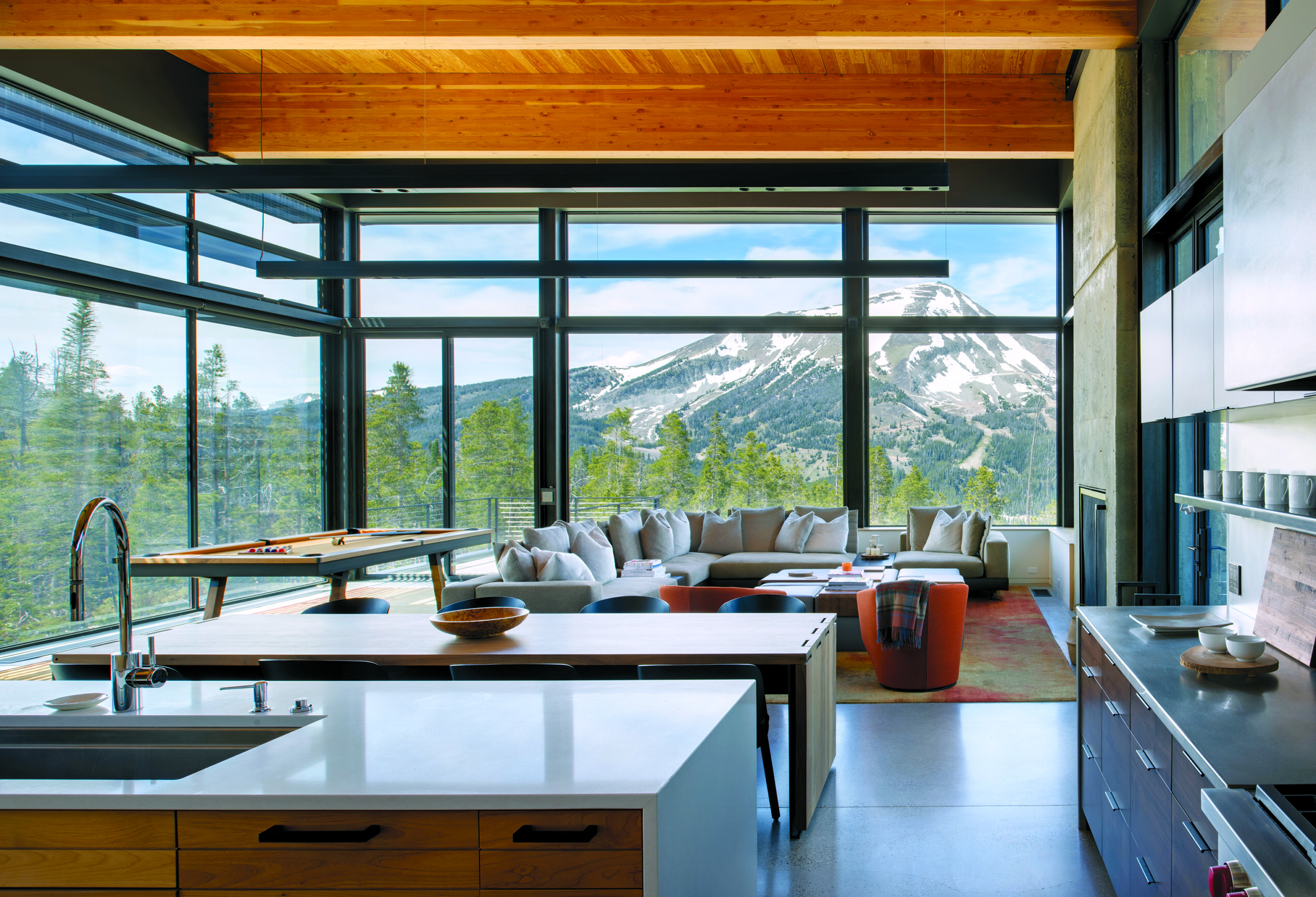 It’s all about the view in the great room, where the kitchen island countertops are by MSI and cabinets fabricated by Homestead Woods complement the SOBU dining table. The billiards table is by Sean Woolsey Studio. | Photo: Whitney Kamman