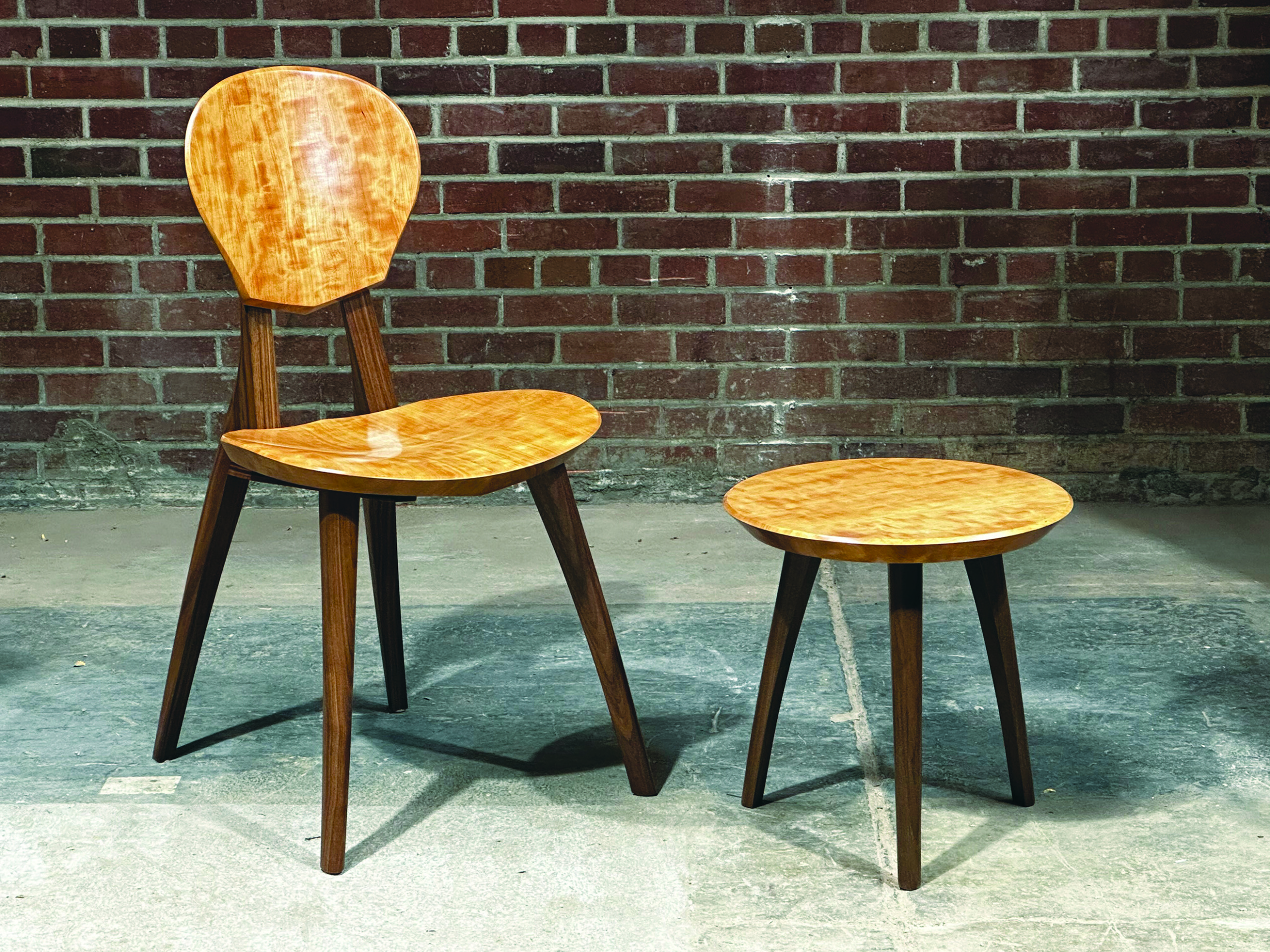 Sonus guitar chair (shown here in bee’s wing cherry with walnut legs) has become an international celebrity. Guitarists worldwide use this ergonomic work of art and praise its excellent support for sitting while playing music. | Photo: Melanie Boggs
