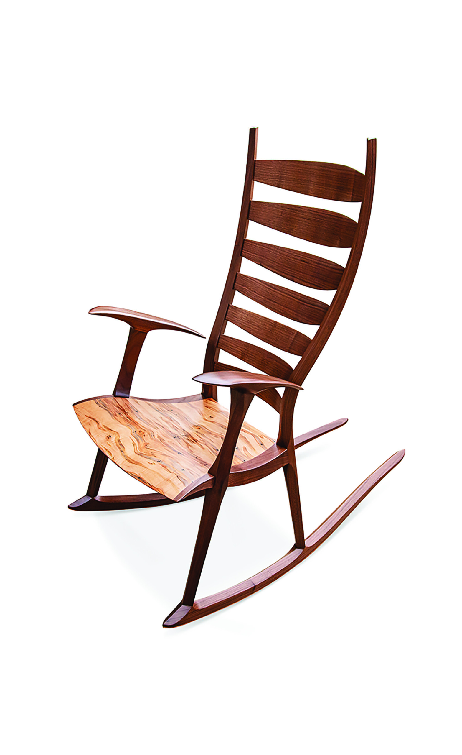 This ladder-back rocker (walnut and ambrosia maple) features an ergonomically shaped seat and back, The seat integrates a bio-composite that makes its thin front edge deceptively strong. | Photo: Melanie Boggs