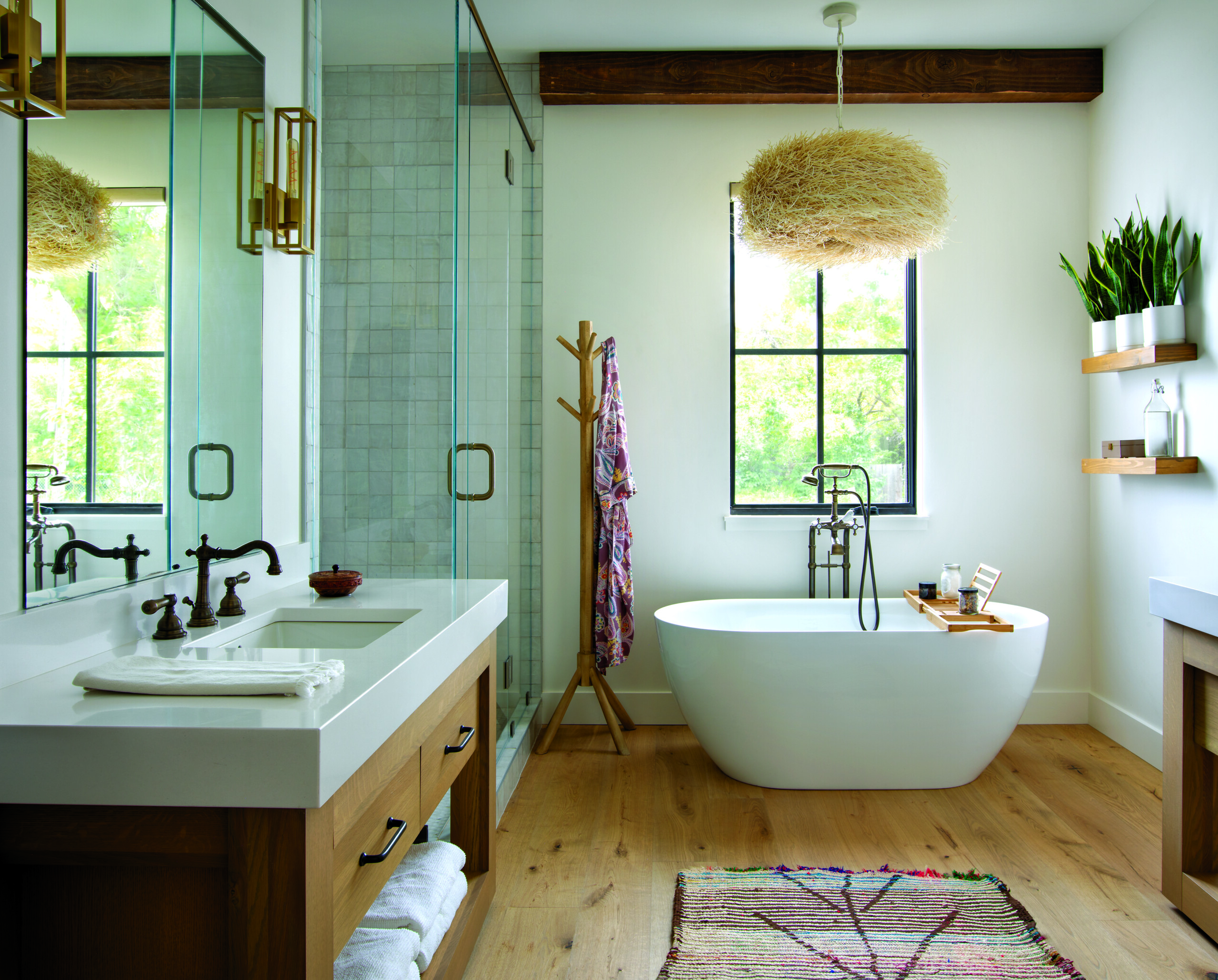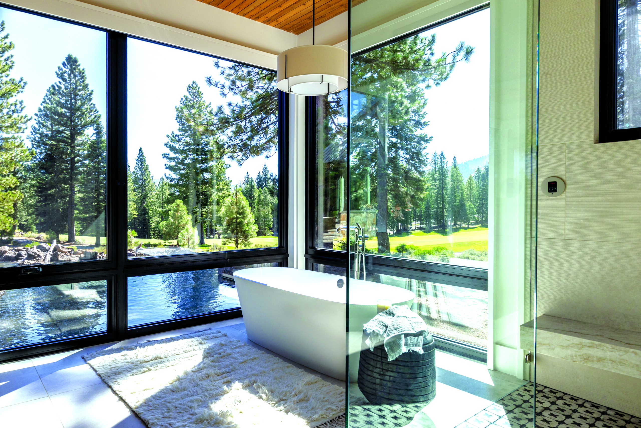 The next-best thing to outdoor bathing is a bathroom with floor-to-ceiling windows. Diana Vincent, lead designer of Truckee, California-based High Camp Home, created this nature-embracing bathroom for a new home filled with light. The homeowners enjoy a beautiful Martis Camp setting, backing to the golf course and opening up to pond and mountain views. “The architecture and setting played to a modern rustic Tahoe home with an original, fresh look and incredible indoor-outdoor aesthetic,” Vincent says.