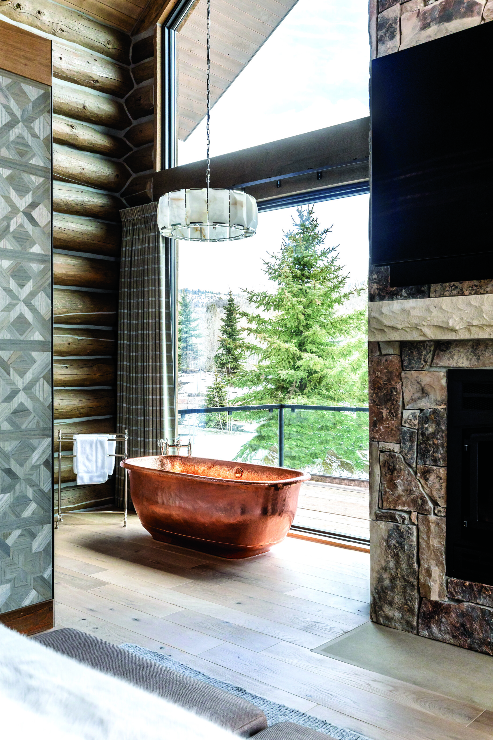 Park City’s Bond Design Company created a rustic-elegant bathroom that adds copper warmth and vintage charm to a 1990s log cabin. The Santorini tub and Avila sink are from Native Trails, and the chandelier is from RH. | Photo: Lindsay Salazar