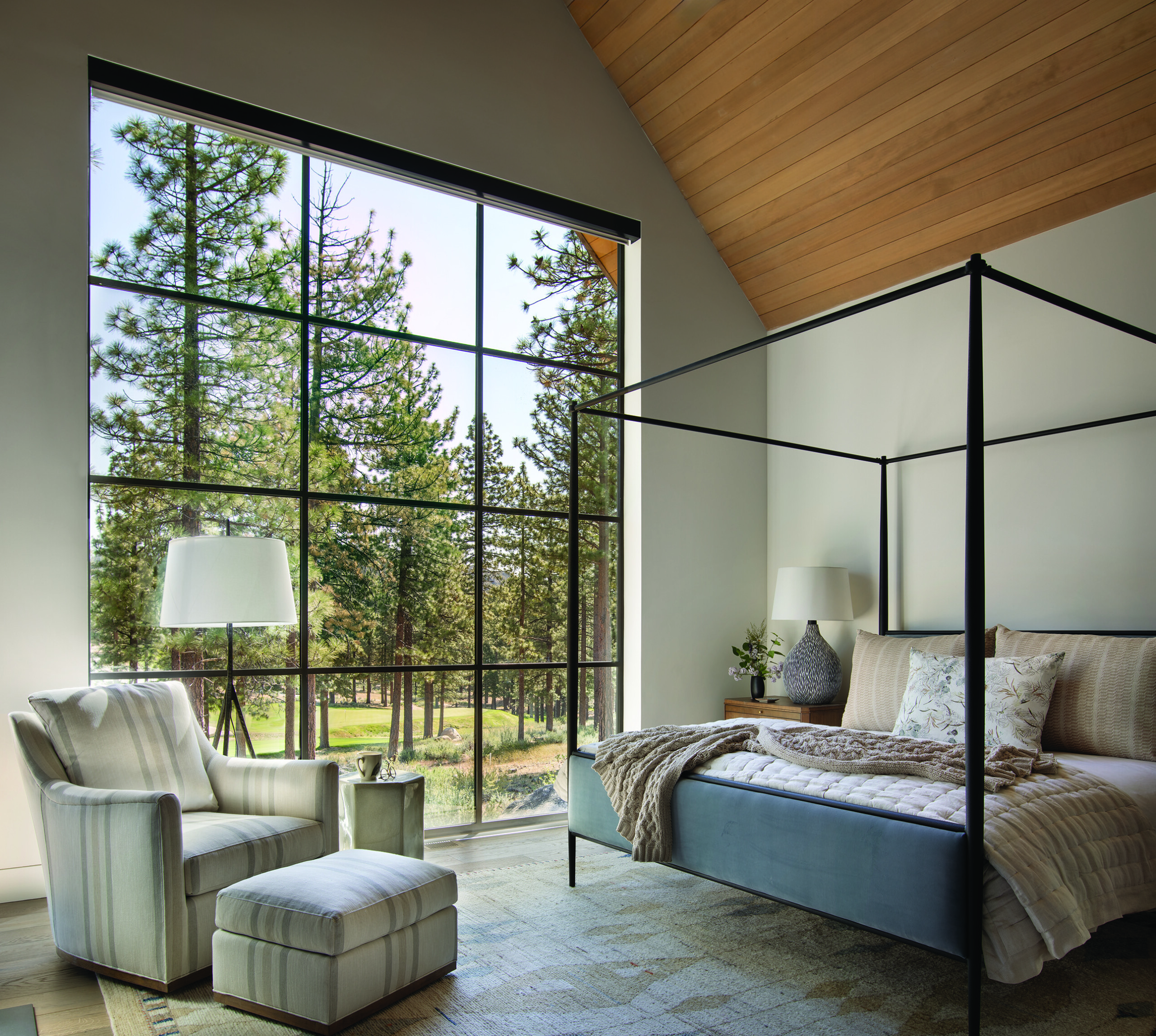 To maximize privacy the primary suite is located down a separate hallway, where it enjoys a strong connection with nature. The bed is by Four Hands, the chair is by Wesley Hall, and the lamp is by Visual Comfort. | Photo: Gibeon Photography
