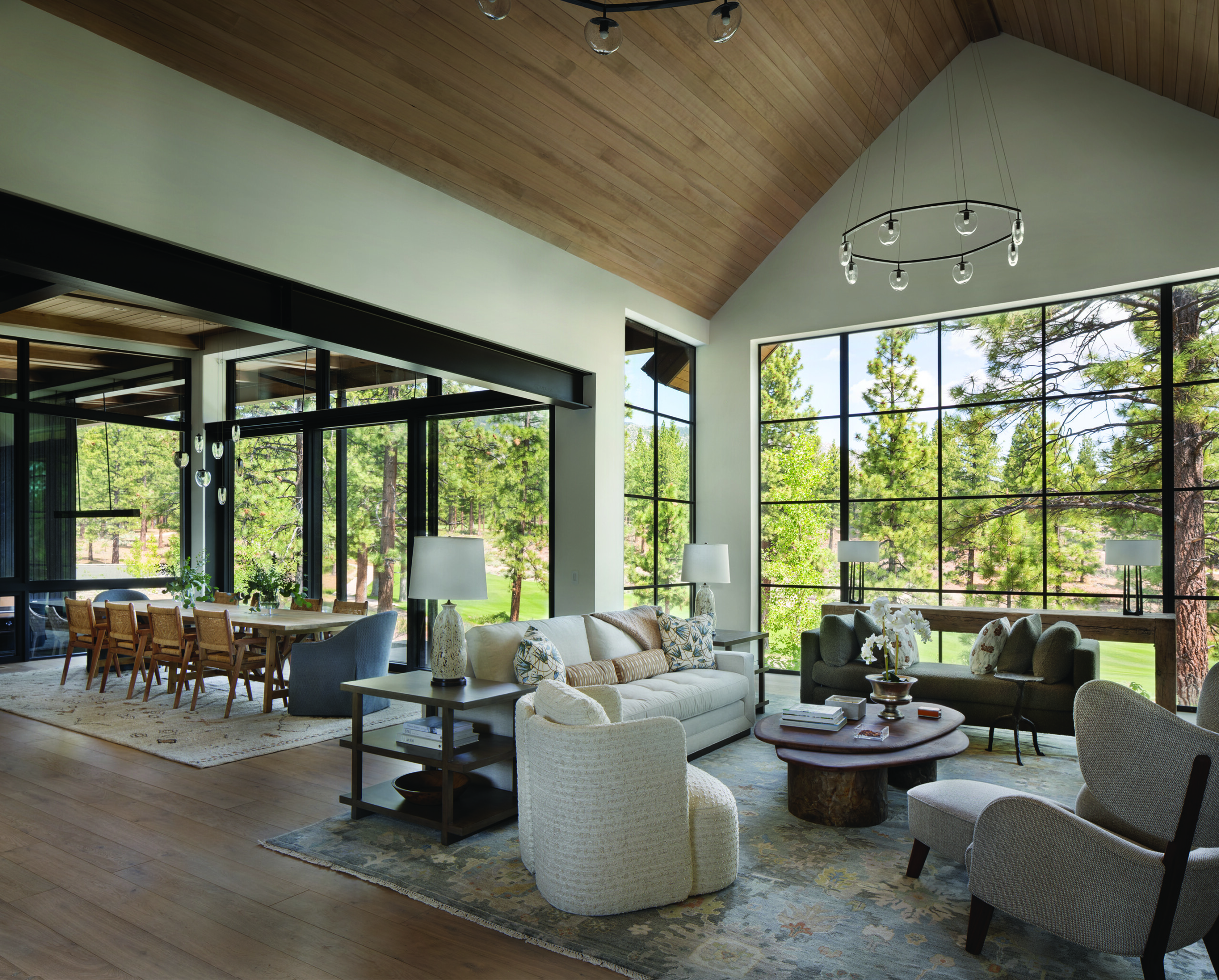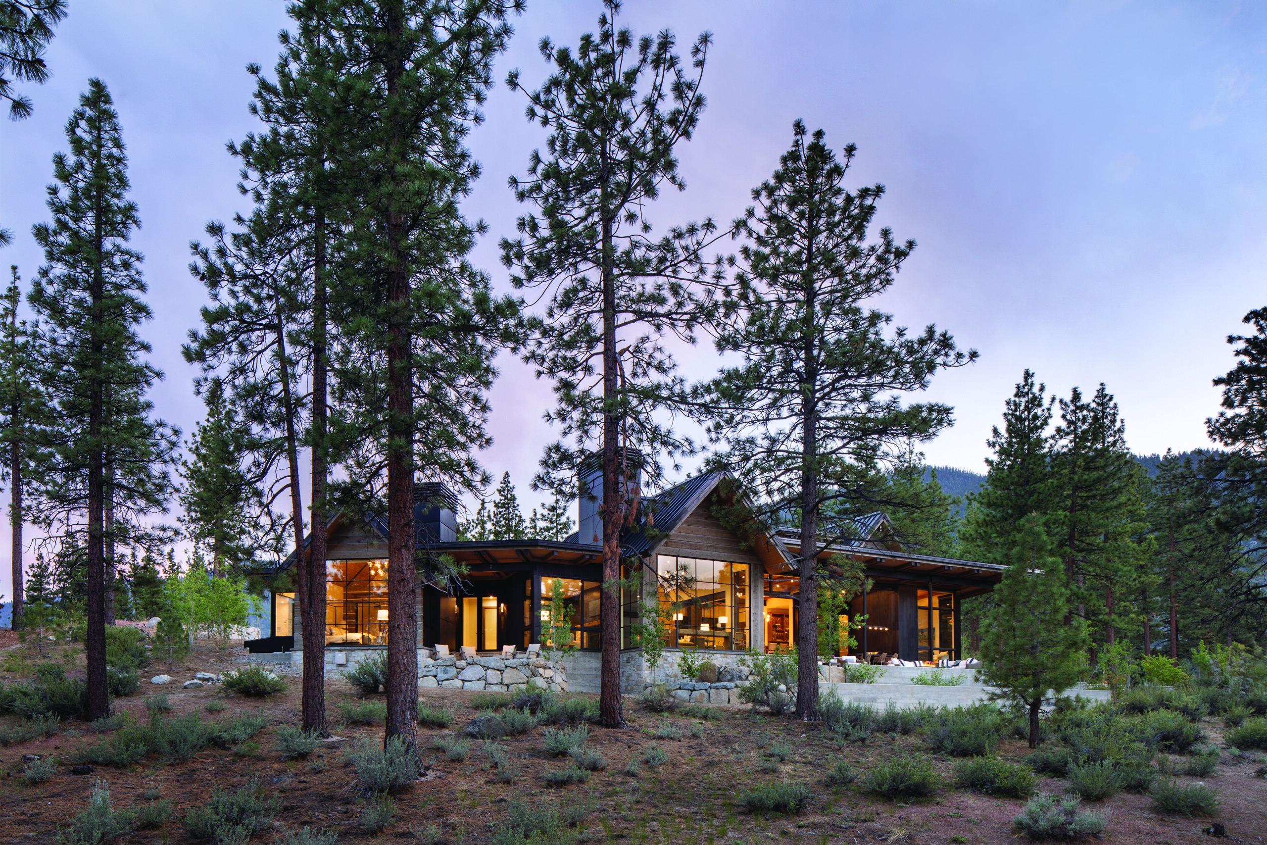 Ask most kindergarteners to draw a house, and they’ll likely sketch the familiar silhouette: a triangle perched on a rectangle; chimney optional. For architect Ryan Marsden, that archetype became a point of departure for a mountain home that reinterprets the classic American cabin for modern living. Set along the Clear Creek Tahoe golf course with easy proximity to Lake Tahoe, Marsden’s version features three such forms clustered around an auto court. “The cabin-like gable structures echo early settler structures such as those at the Mormon Station Trading Post in nearby Genoa,” he explains.