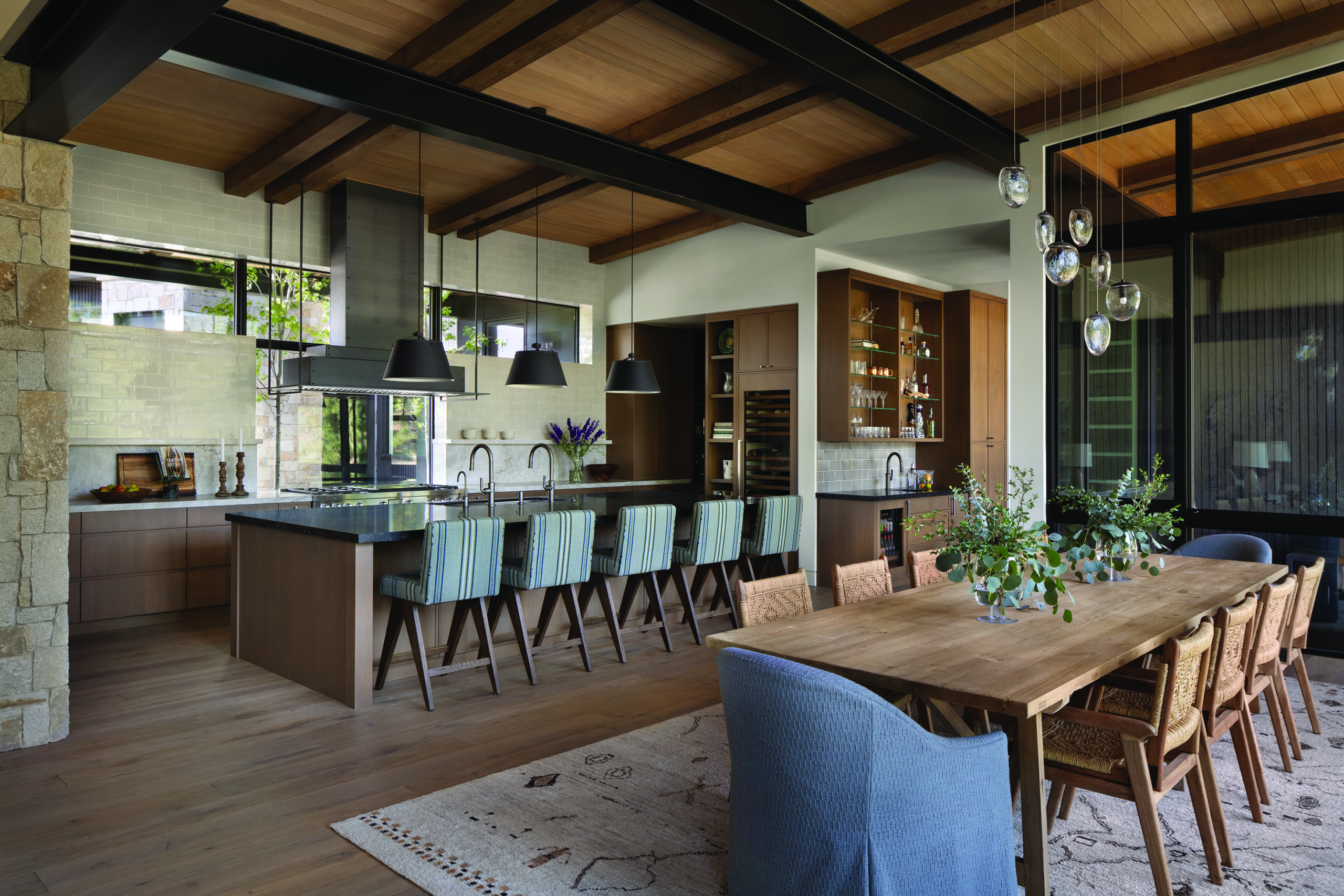 Natural stone kitchen counters and oak cabinets complement the overall aesthetic. Counter stools are by RH. In the dining area, Old World Antieks side chairs and Century Furniture host chairs surround the Cohab Space table. | Photo: Gibeon Photography