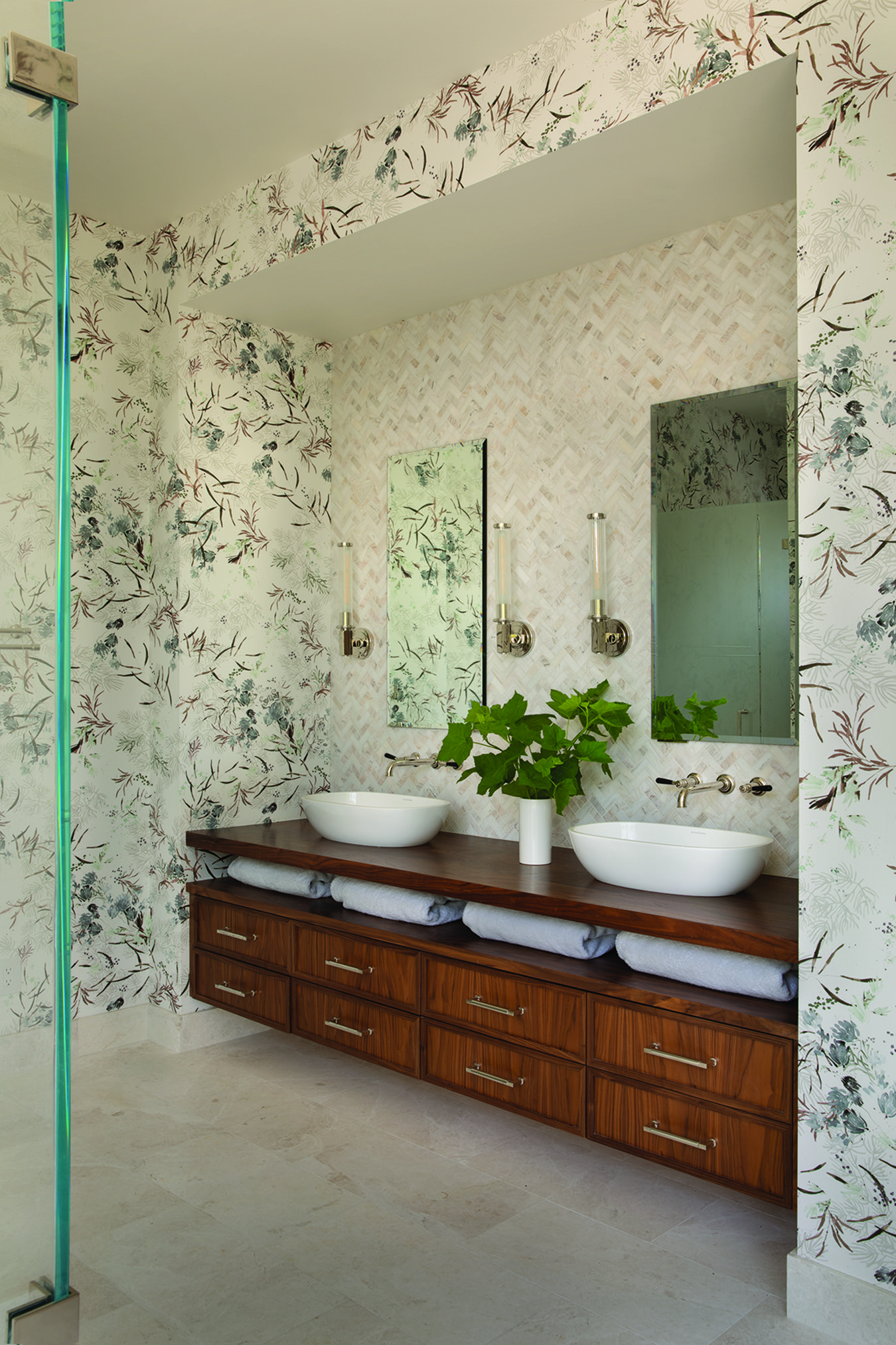 In collaboration with Julie, the designer selected distinct wallpapers to bring personality to each bathroom. A feminine floral, for example, backs the wood vanity in the primary suite, while playful, vintage-style drawings of skiers and boaters in an upper-level bath are a nod to the locale. Coupled with the overall design, such moments contribute to a living experience that fully connects its inhabitants with their surroundings and to their lifestyle. As Michael concludes, “Ryan didn’t just build a house, he built a home just for us.”