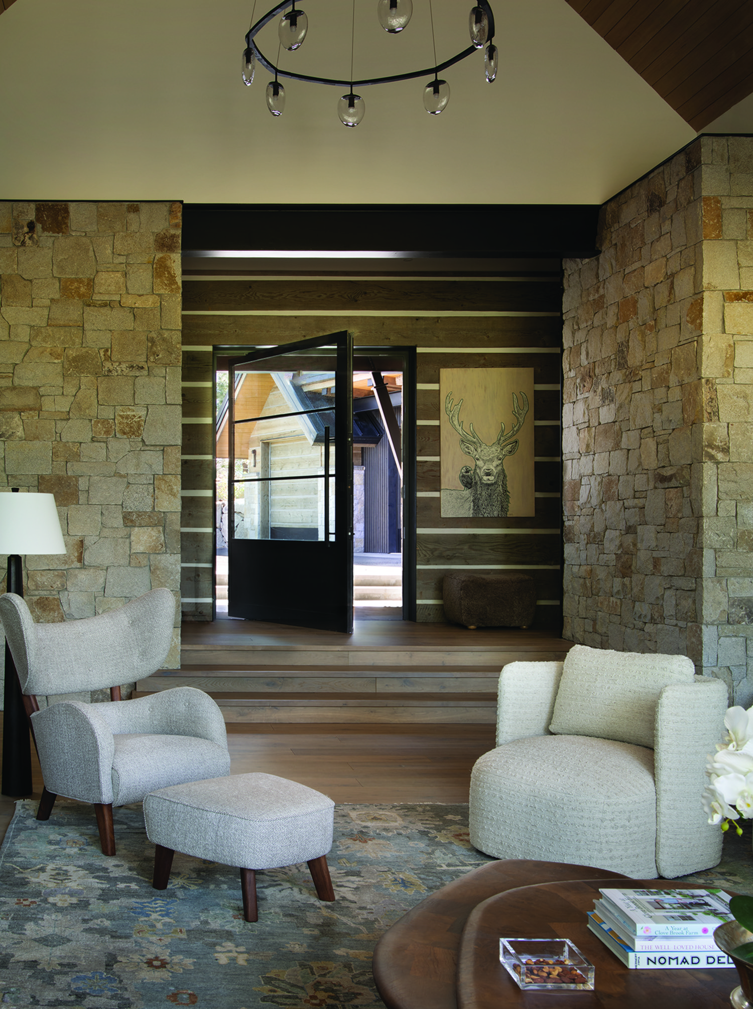 Marsden then layered those traditional shapes with intersecting contemporary shed roofs clad in raked western red cedar—stained jet black. Chinked timbers and stacked stone ground the home in a Western vernacular, while the sleek rooflines push it in a modern direction. The result reflects homeowners Julie and Michael Hughes’ request for a dwelling that balances past and present. “We wanted a new spin on a classic,” says Michael, who envisioned a home that could easily host gatherings—and coax their grown children back to visit. Single-level living was another priority, but the sloped property mandated some compromises.