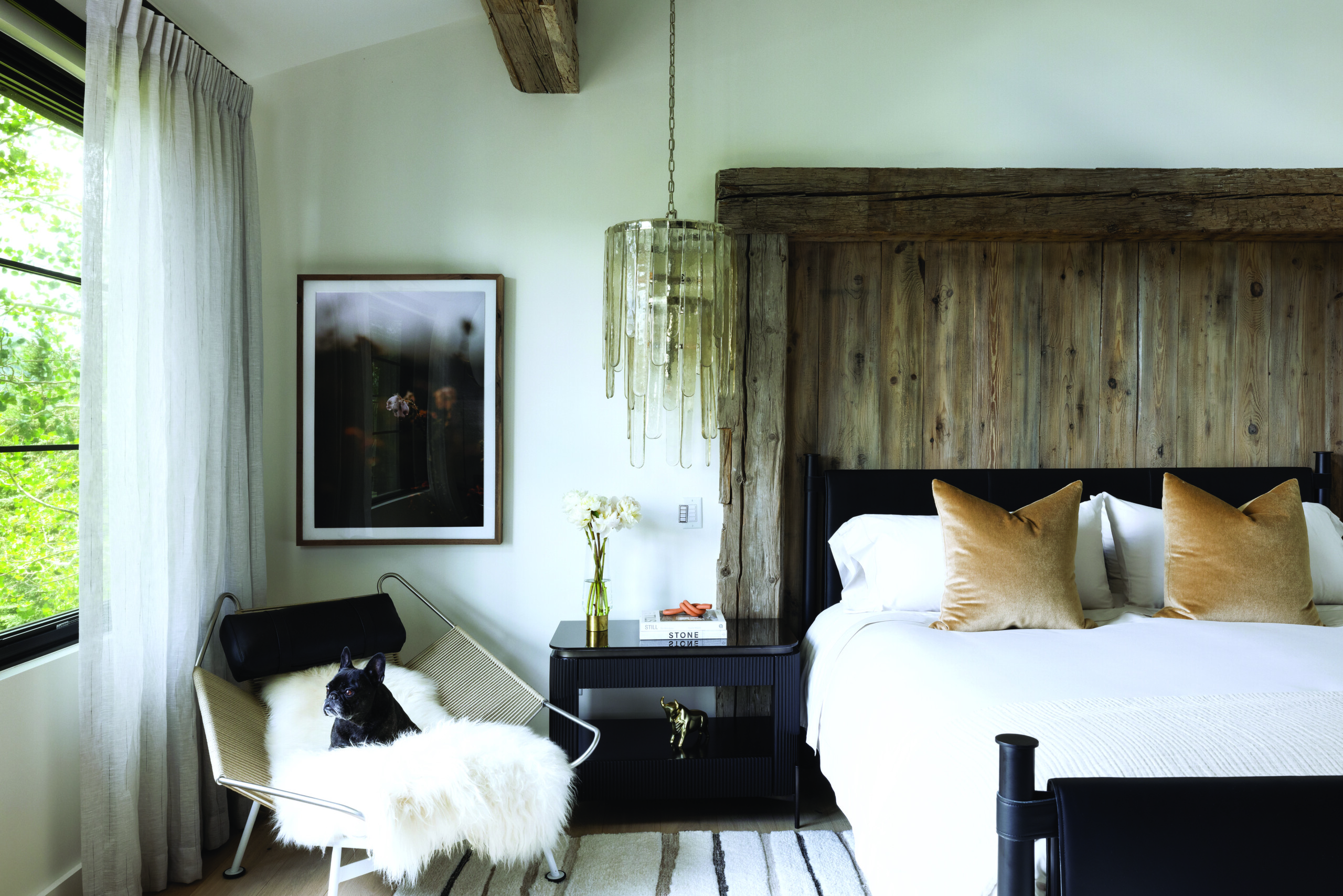The designers at Studio James custom-designed the reclaimed wooden headboard surround in the primary bedroom of this Cordillera, Colorado, home. A PP Møbler side chair brings additional texture while a Hudson Valley Lighting pendant adds a modern twist. Studio James, Edwards, Colorado. | Photo: Ric Stovall