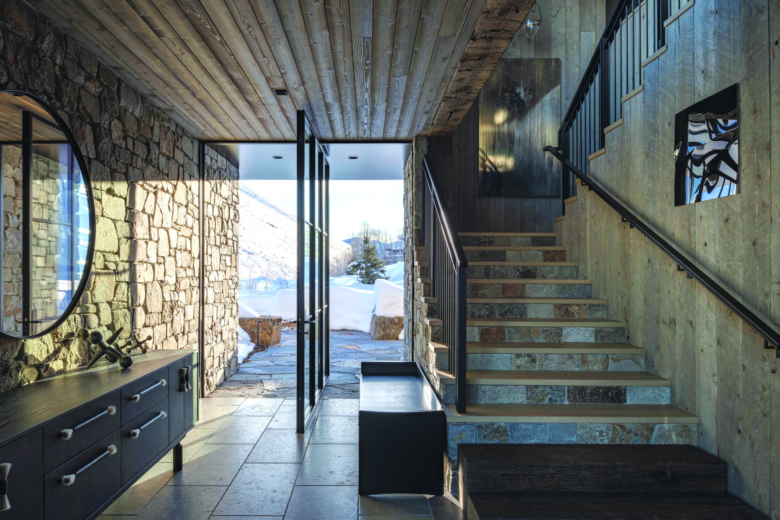 “The building location was due to neighborhood restrictions within a building envelope and to avoid the avalanche zone that occurs on the site. It’s a hillside project located at the toe of the mountain where it starts to flatten. We put it as high as we could get it,” Payne says. “The primary suite and public spaces are on the second level to take advantage of the amazing views east, west and north, with the south being the hillside.”