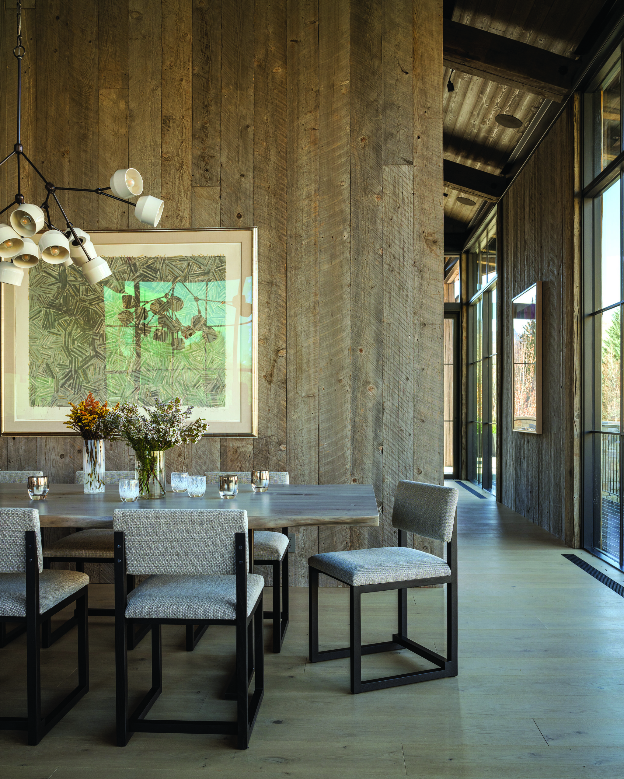 They also needed square footage that could sleep a crowd but wouldn’t feel massive when it was just the two of them. Hoey immediately understood the assignment. “We worked on creating a moody, contemporary cabin-in-the-woods feeling with lots of glass and rustic elements like reclaimed wood and stone masonry—things that connected the home with the landscape.”