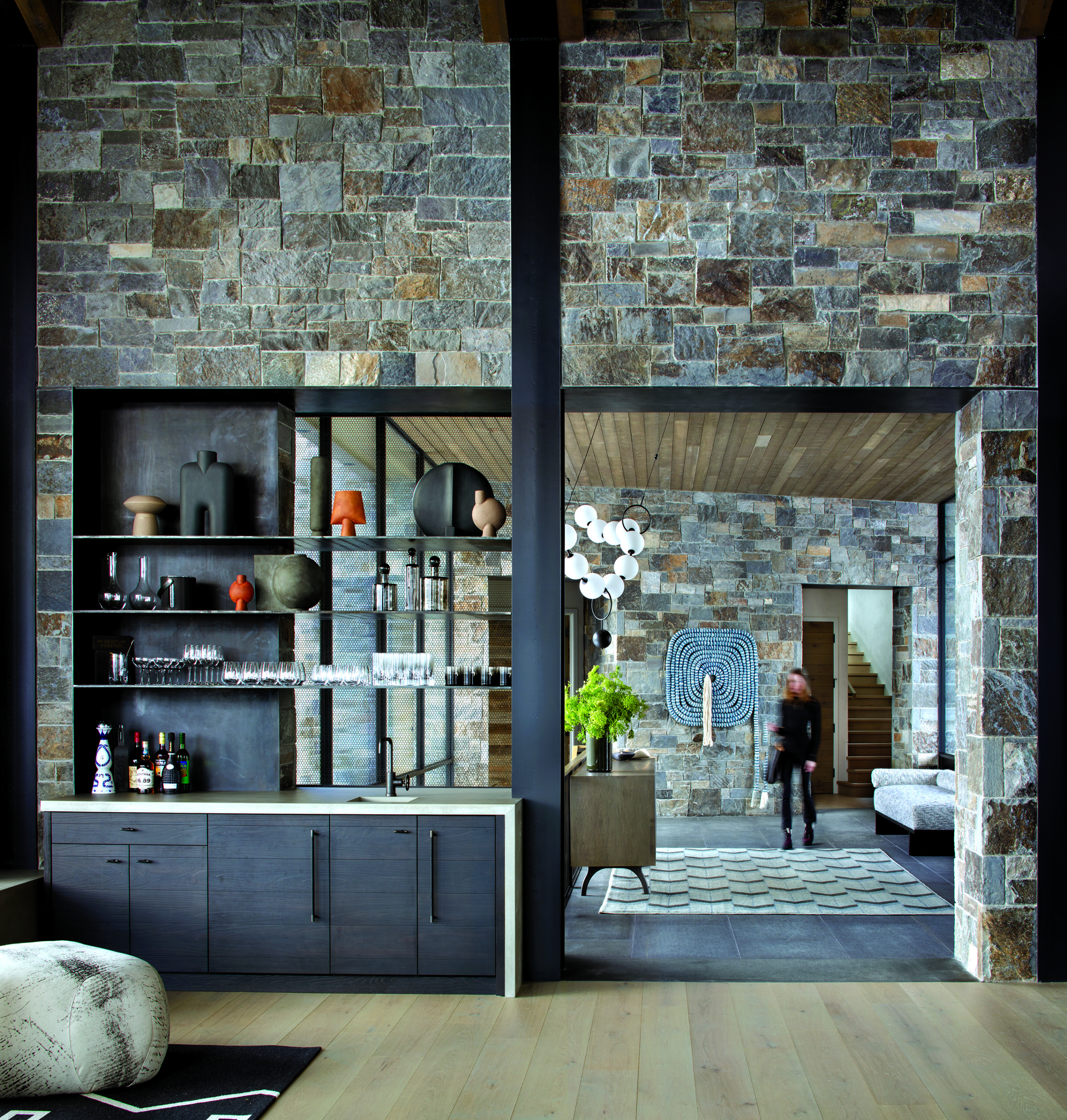 In Big Sky, Montana, the homeowner, principal of Sane Designs, worked with Suede Studio to include moody finishes like the black- and-charred millwork that complements the stone walls. SANE DESIGNS New York City, SUEDE STUDIO Ketchum, Idaho. | Photo Gibeon Photography