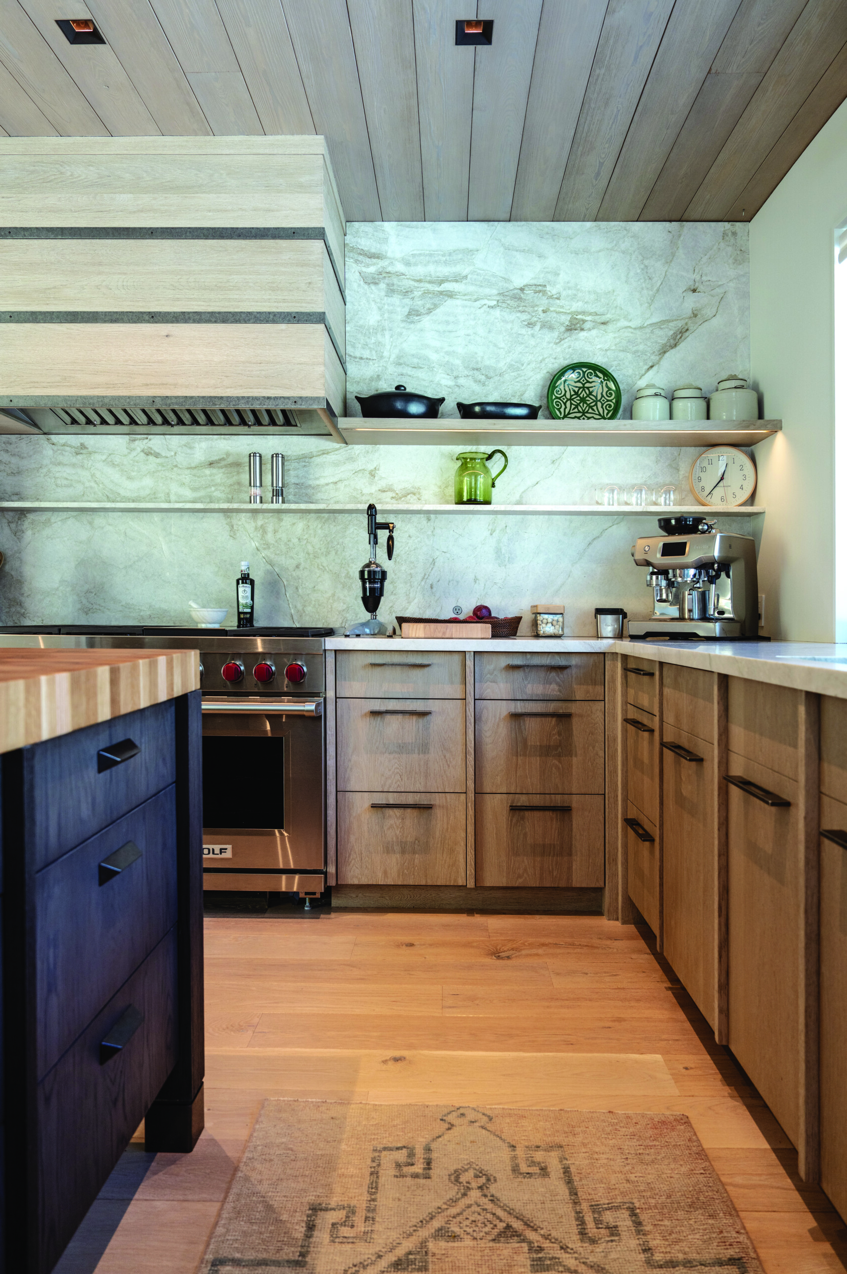 For the revamp of this once-dated kitchen in Ketchum, Idaho, interior designer Elizabeth Ellis, principal at Ellis Interior Design, worked closely with the homeowner (co-founder of Rocky Mountain Hardware). “Now open to the great room, the kitchen has an open concept feel … but the lowered wood ceiling adds warmth and gives it a more intimate feel,” Ellis says. One of the 12-by-20-foot kitchen’s outstanding features is an ebonized white oak island with a butcher-block top and plenty of drawers to keep everything neatly organized.