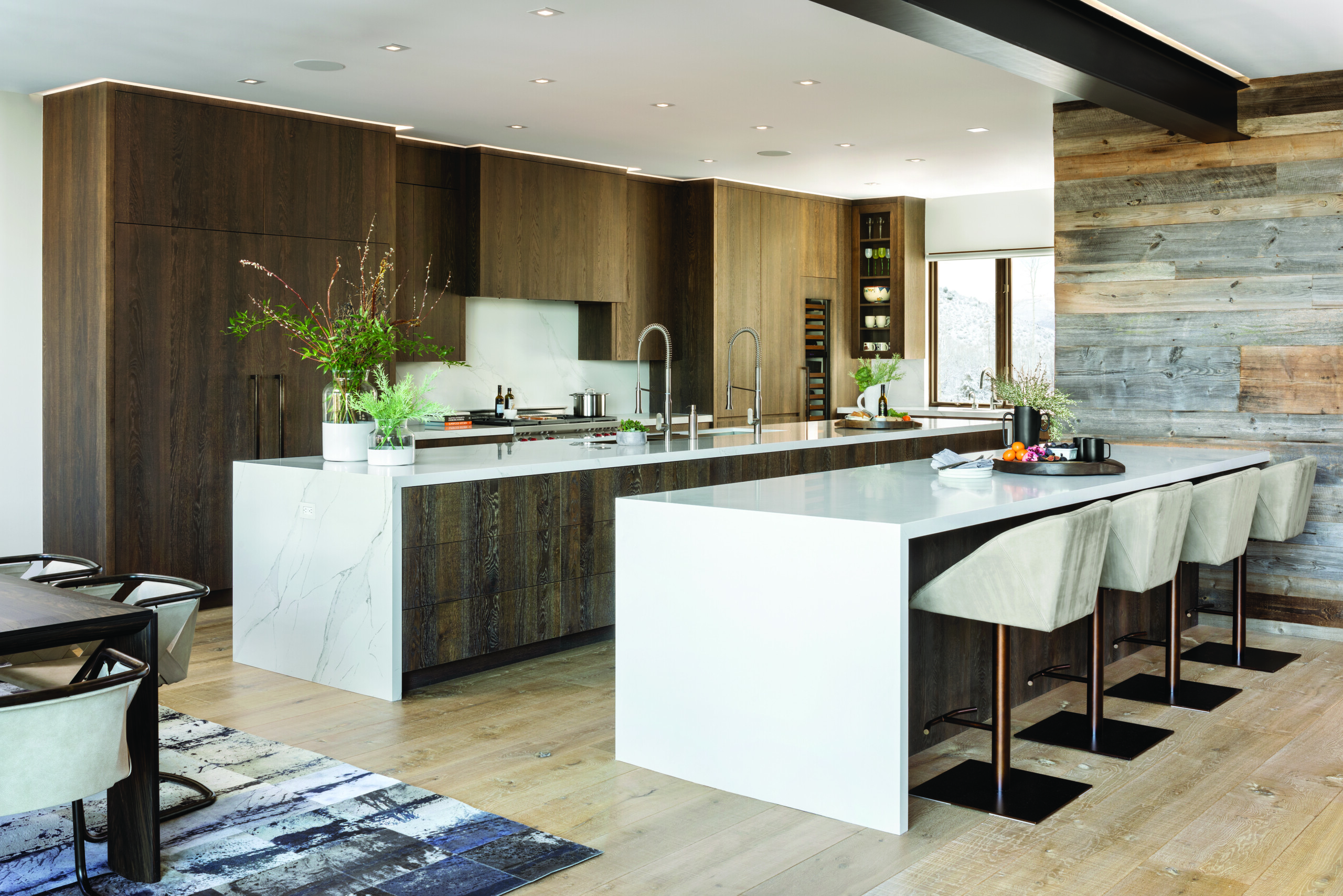 Once a dark, low-ceilinged room cut off from the rest of the home, this Beaver Creek, Colorado, kitchen has been transformed into a light-filled gathering space anchored by two islands—one dedicated to cooking, the other for family to congregate. The homeowners also wanted the space to flow seamlessly into the great room, inviting both cooking and conversation. Designer Yvonne Jacobs of Jacobs + Interiors was enlisted to create a contemporary kitchen that would also reflect its high-country surroundings. “I used Arrigoni oak floors, rough-hewn cabinetry and burnished