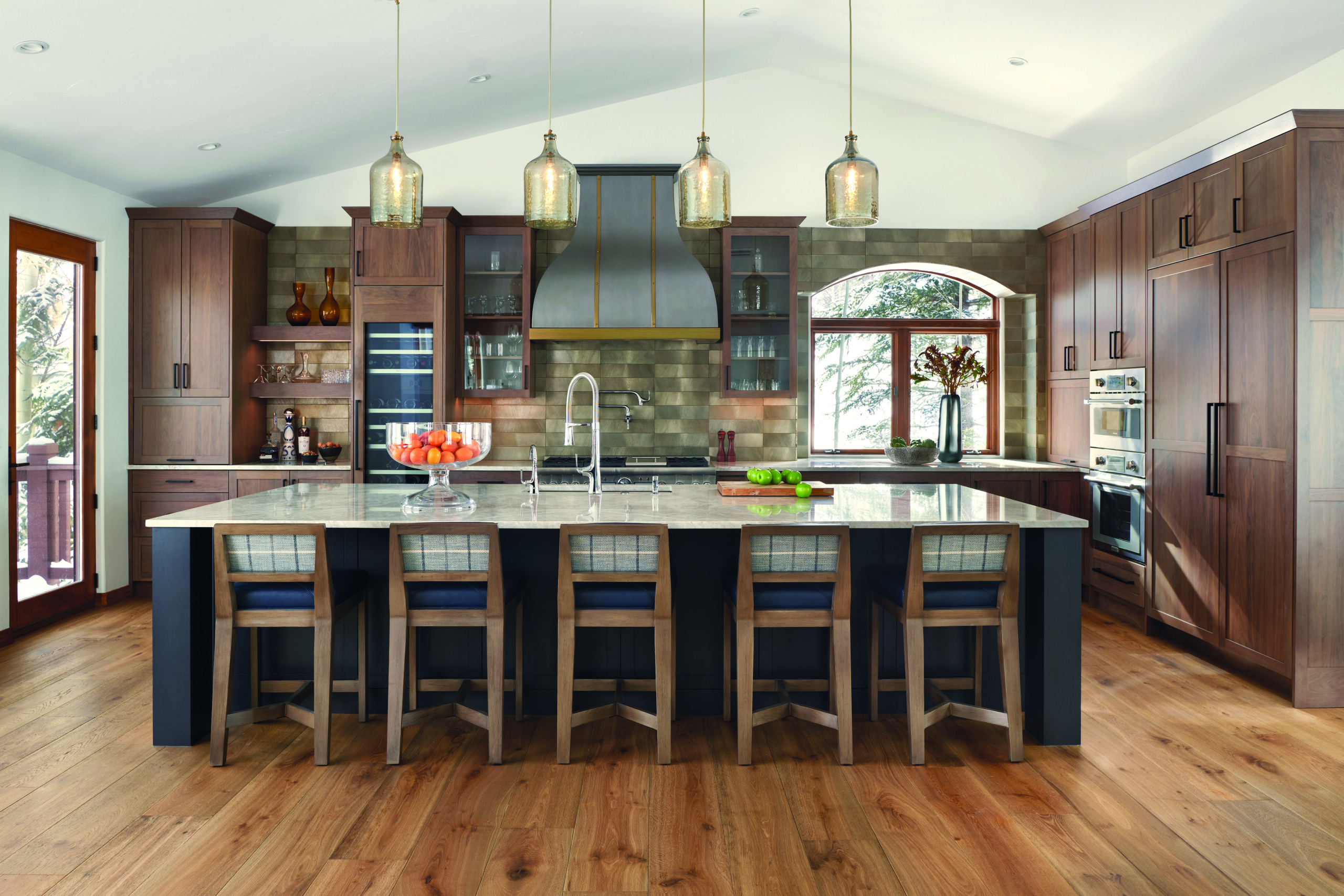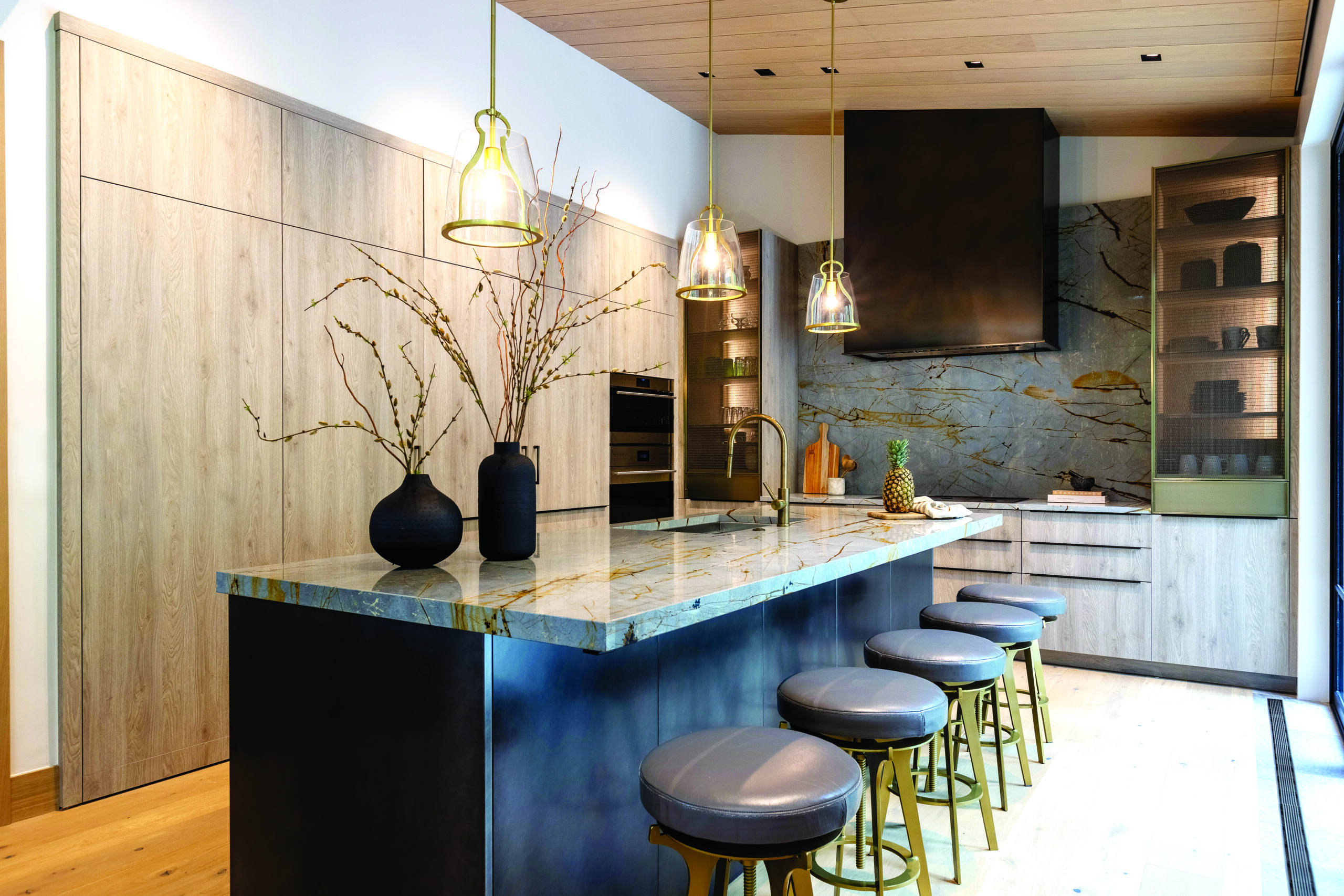 Each of these mountain kitchens includes a special design element that makes it a one-of-a-kind design. From gold-veined stone countertops and back­splashes to customized hardware, a handy elevator and push-button storage spaces—each kitchen has a unique story to tell.