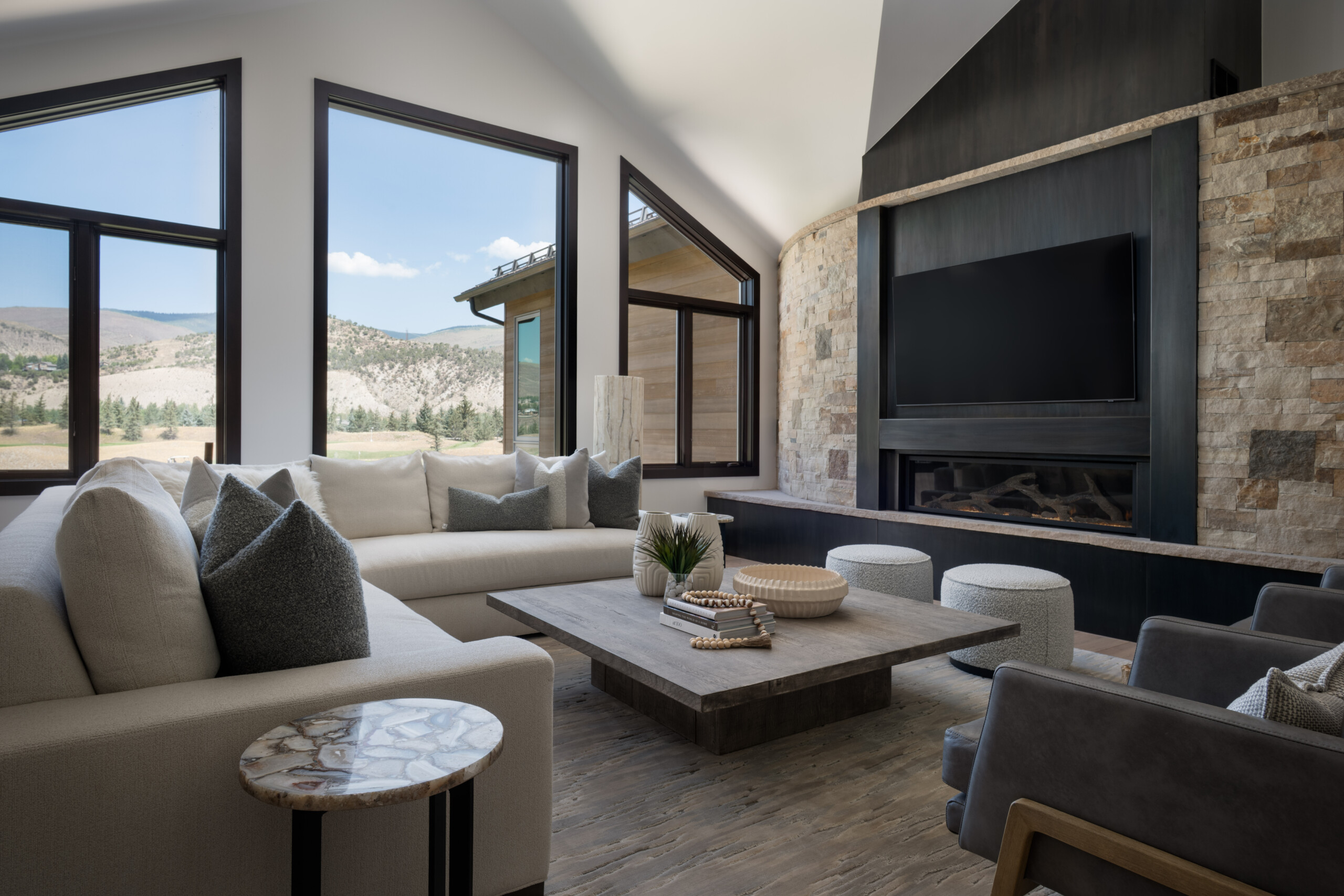 Our client envisioned a distinctive mountain retreat with the rare perk of being able to fly in by plane paired with warm, welcoming spaces just minutes from the slopes. Our design focused on creating abundant outdoor living spaces, including a large cowboy-style cauldron fire pit, indoor/outdoor dining areas and plenty of room for friends and family to gather. Inside, we added a spa-like bathroom and opened the space to frame the stunning mountain views—bringing together comfort, connection and the beauty of the outdoors.