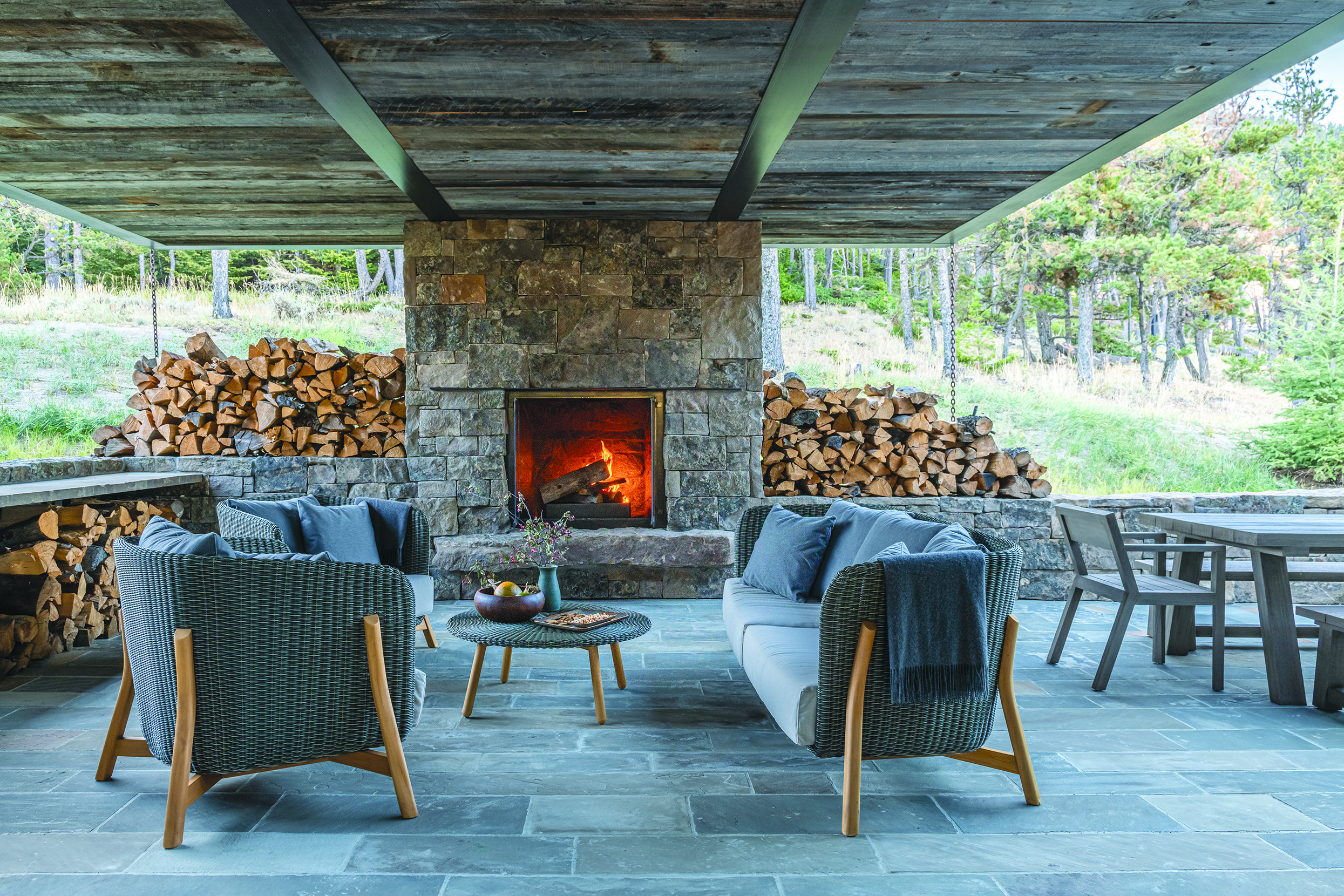 This sheltered outdoor dining area in this Red Lodge, Montana, home is cleverly tucked between the house and a forested hillside. Furniture from Home Infatuation. | Photo: Audrey Hall