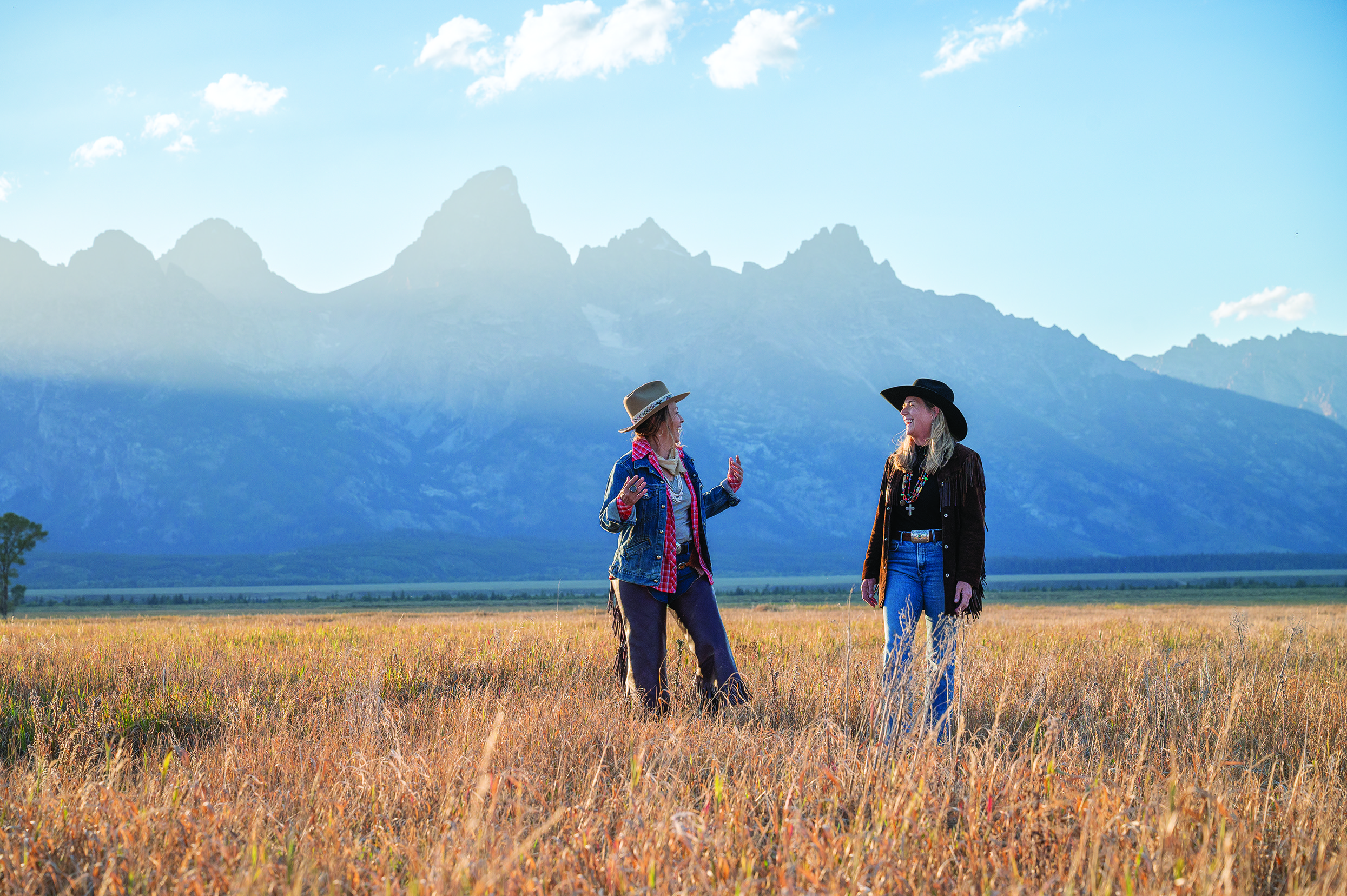 Photographer Audrey Hall and author Chase Reynolds Ewald pose with the Tetons as background. “We love working together with the great American West as our office,” says Hall. | Photo: Lisa Flood