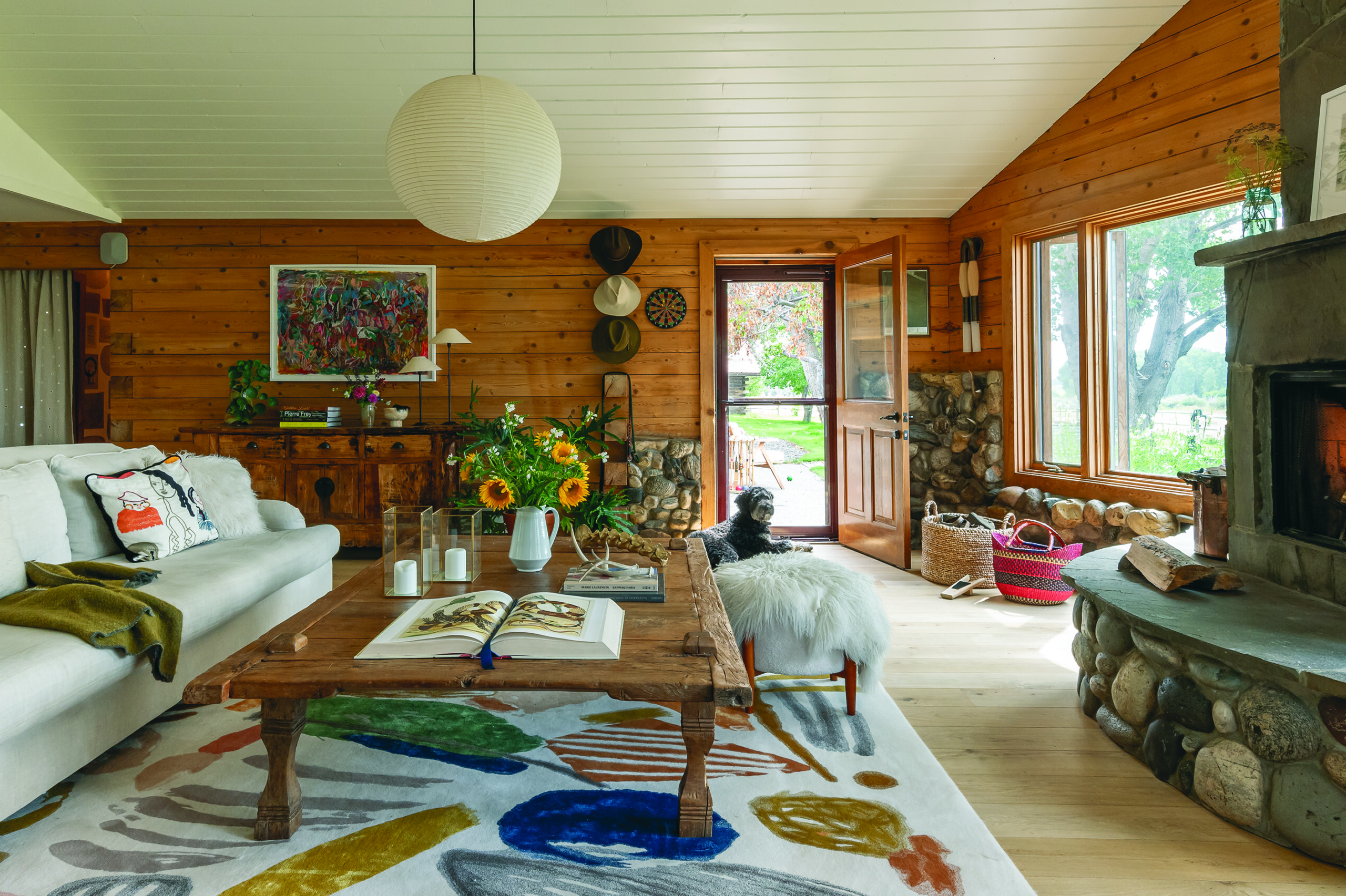 Fiona West’s living room in her Montana log home combines vintage cowboy hats, an Apparatus lighting fixture and a coffee table crafted from a vintage Indonesian bed. The Pierre Frey rug provides color and energy. | Photo: Audrey Hall