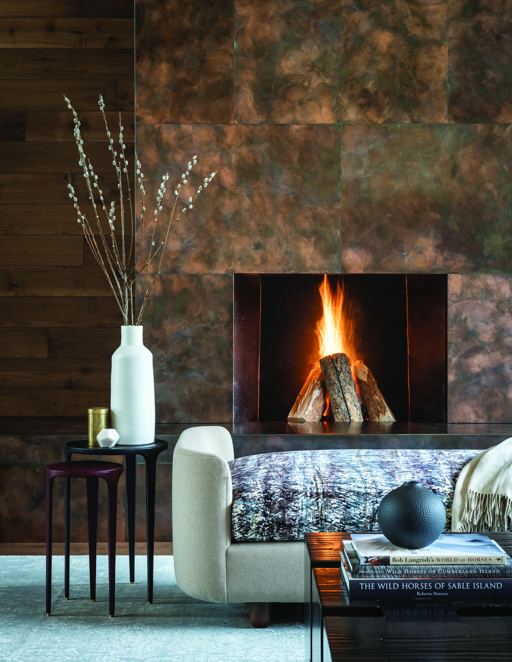 Mimi London’s Three Timber coffee table, a Belgard daybed from Dmitriy & Co. and Wisp nesting tables from OCHRE are backed by the warm glow of a custom copper-paneled fireplace surround in this Jackson Hole, Wyoming, home. | Photo: Audrey Hall