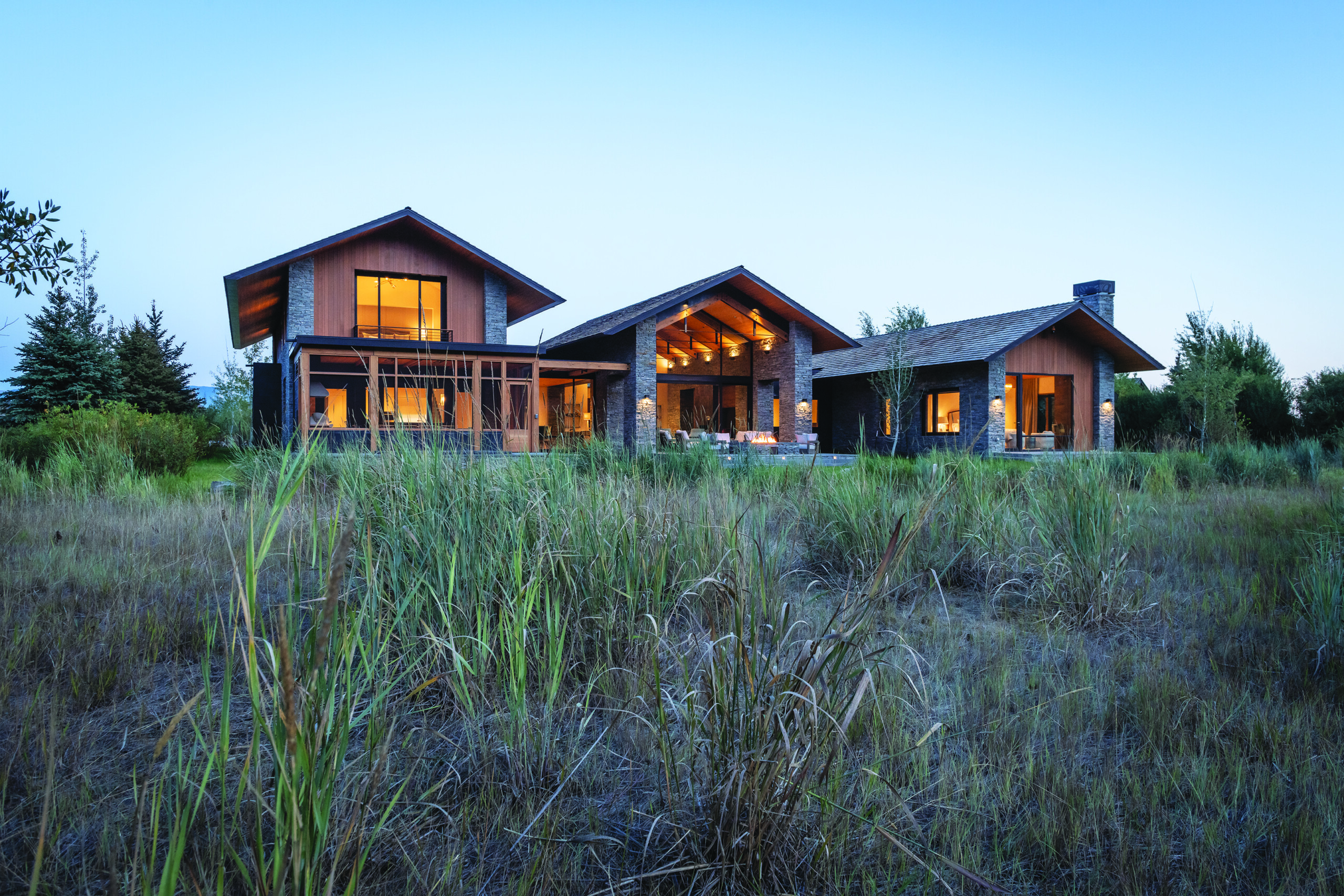 Built of stained cedar, charcoal quartzite and patinaed copper with a shingle roof, this Jackson Hole, Wyoming, home presents as three gabled forms, surrounded by low stacked-stone walls and planters with aspens. Roofs constructed with cross-laminated timbers allow large overhangs (up to seven feet) in both directions. | Photo: Fiona West’s living room in her Montana log home combines vintage cowboy hats, an Apparatus lighting fixture and a coffee table crafted from a vintage Indonesian bed. The Pierre Frey rug provides color and energy. | Photo: Audrey Hall