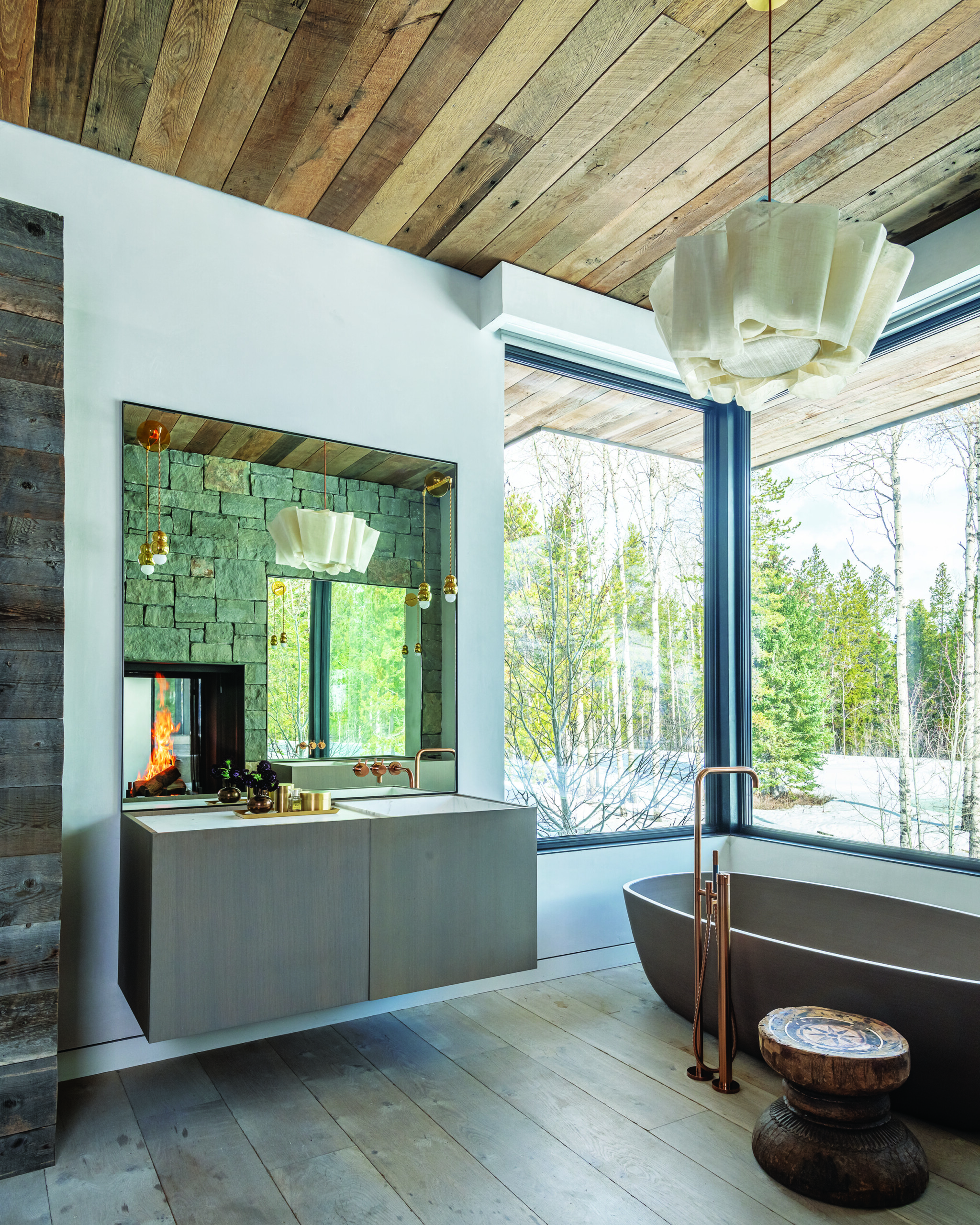 Reclaimed boards, reclaimed white oak, natural patinaed steel, limestone veneer and board-formed concrete give this Jackson Hole, Wyoming, primary bath a consistent palette throughout. | Photo: Audrey Hall