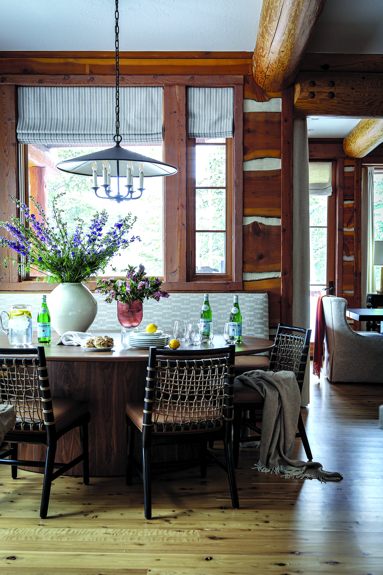 Engle’s approach is rooted in honoring existing elements while introducing new ideas that feel natural. “With every remodel, you’re working with what’s there, and that requires ingenuity and flexibility,” she explains. “You have to let the structure speak to you.” Here, the structure spoke loudly: soaring log beams from Finland, mellowed to a warm tobacco hue, and a log staircase so sculptural it looks like a piece of art. The stair railings, which the homeowners once considered replacing, became one of the defining features. “Amanda insisted we keep them, and she was so right,” Mary says.