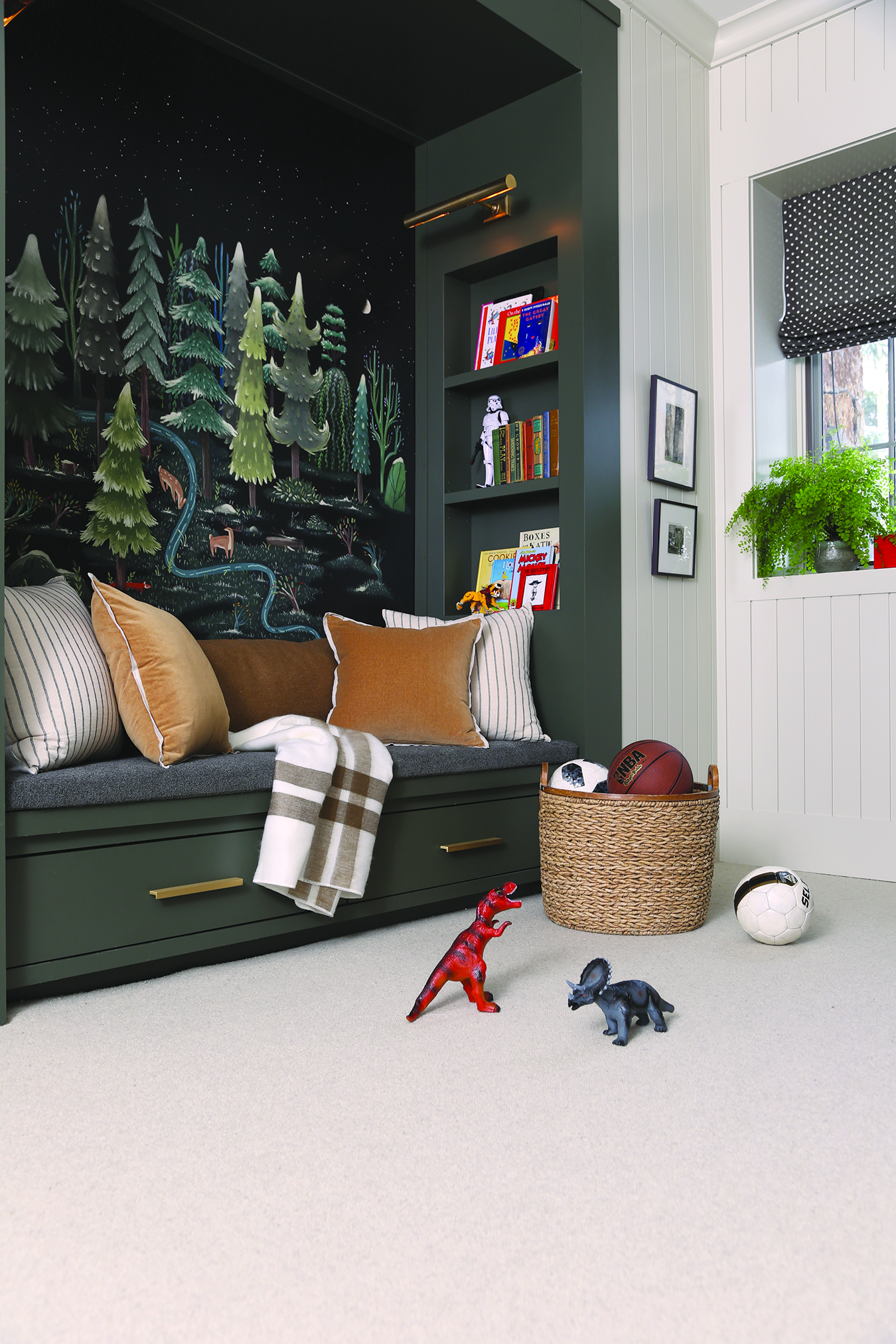 The homeowner fell in love with this wallpaper and asked designer Amanda Engle to use it in the bunk room, where it makes a whimsical backdrop for a cozy reading nook. | Photo: Laura Bruschke