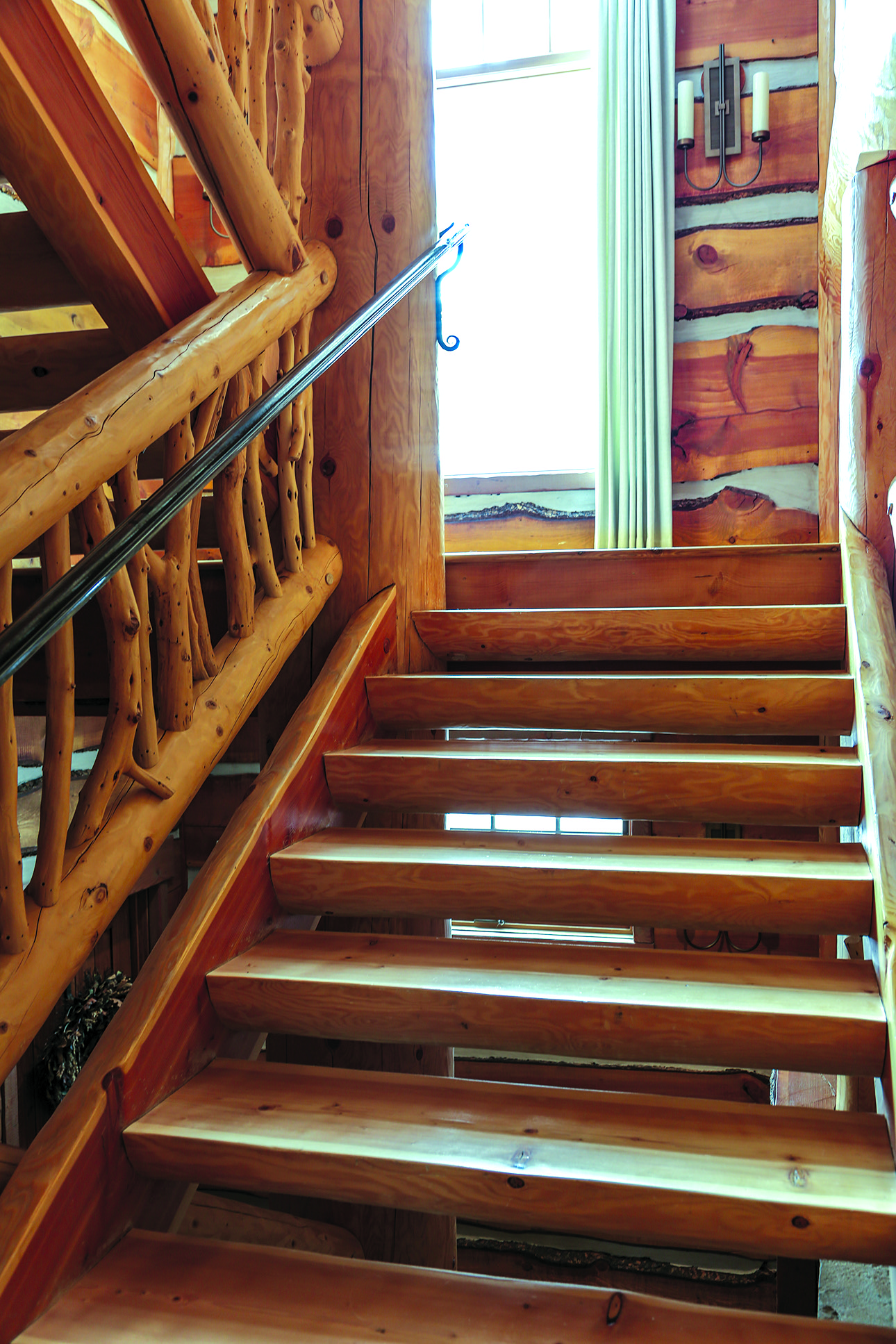 The log staircase has taken on a warm tobacco hue over the years. | Photo: Laura Bruschke