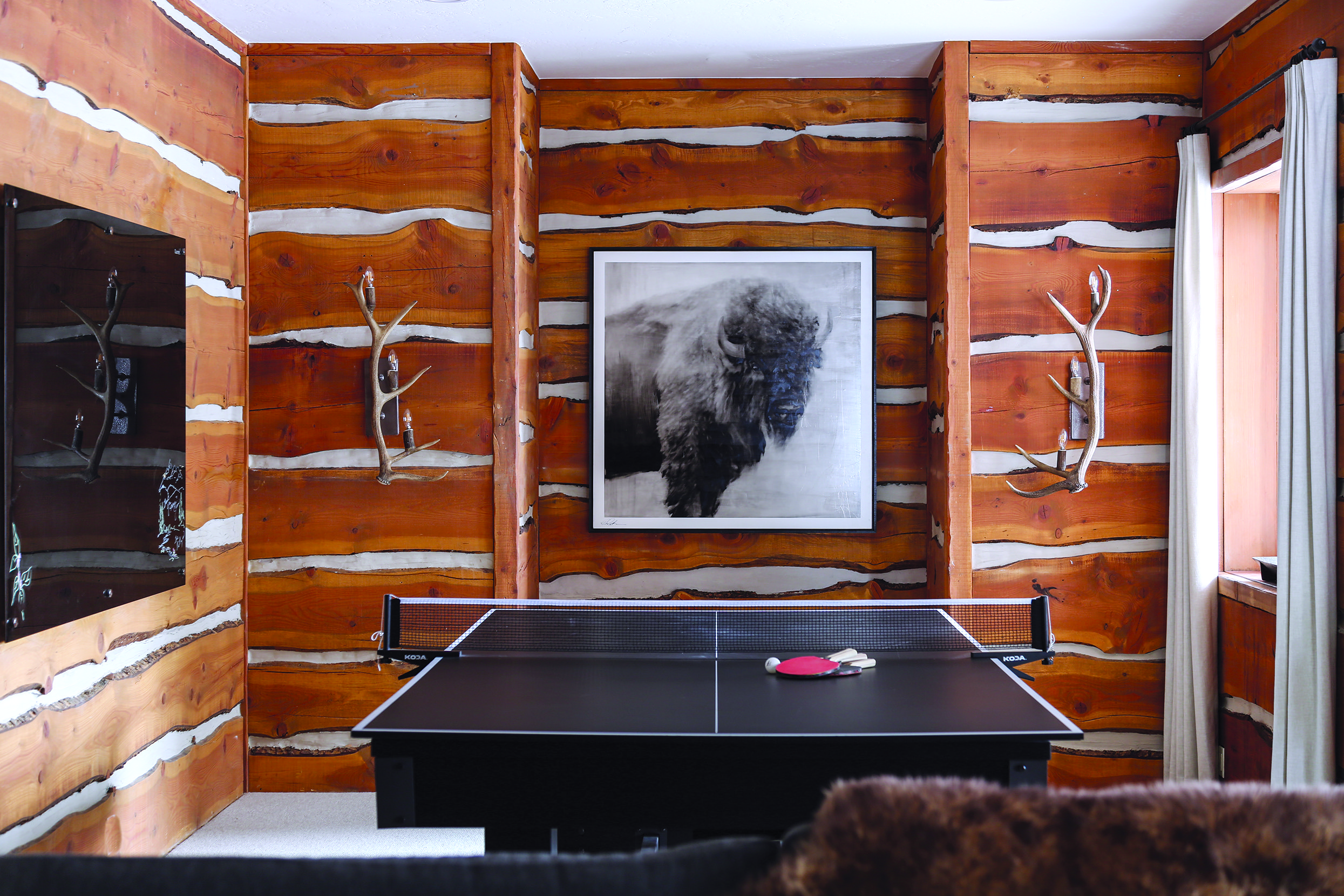 The basement level holds a ping-pong table for family fun. Antler sconces and the clients’ own buffalo artwork further the home’s mountain vibe. | Photo: Laura Bruschke