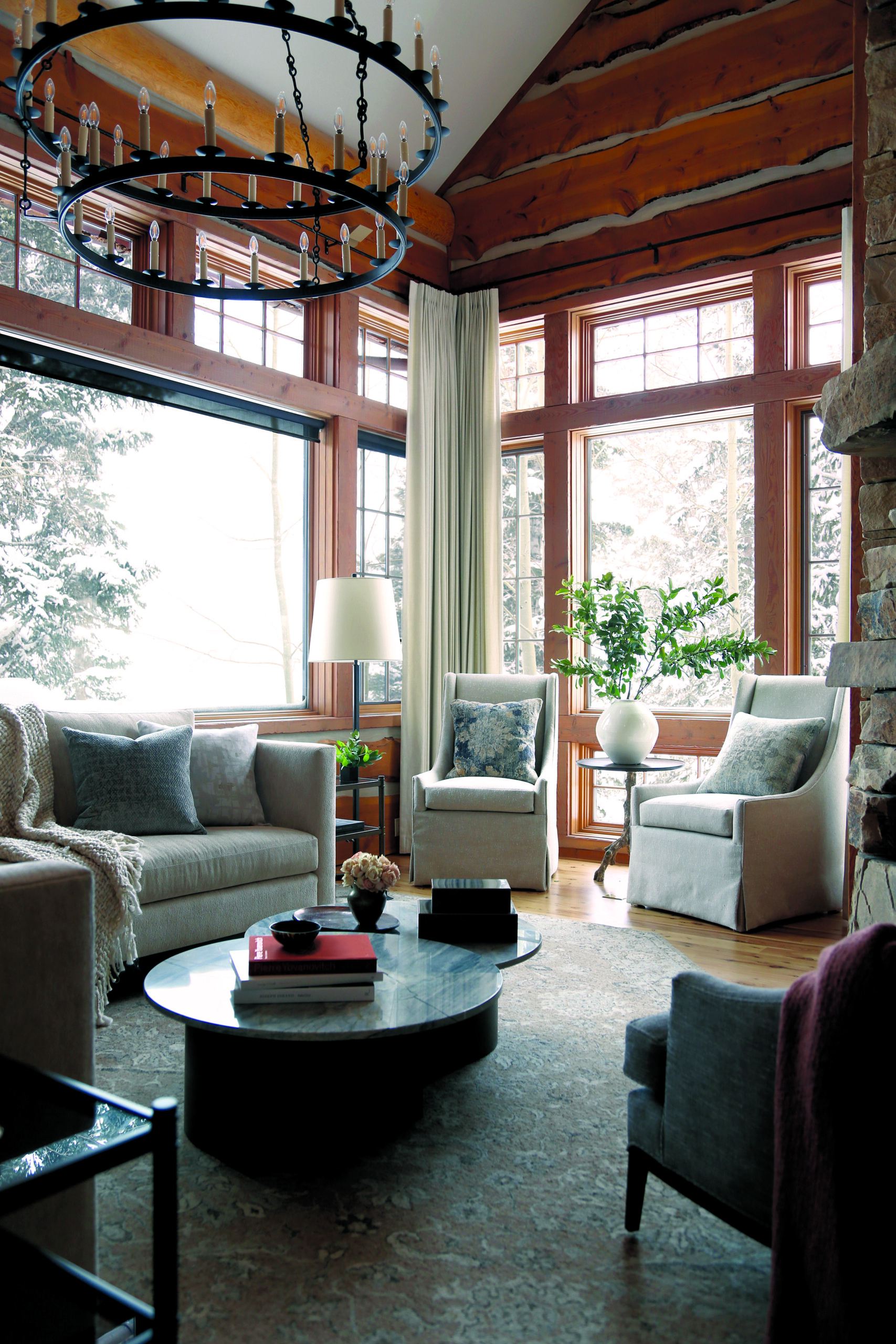 Contemporary and rustic meet in the living room, where a two-tiered iron chandelier hangs above a collection of custom-made clean-lined furniture, including a quartzite-topped coffee table. | Photo: Laura Bruschke