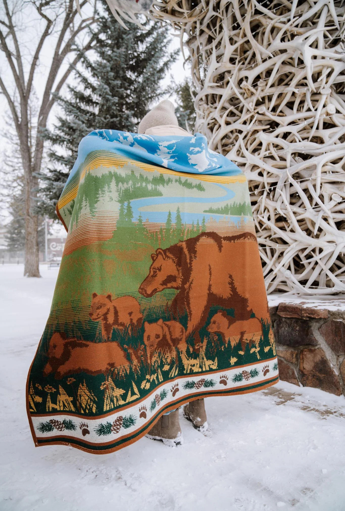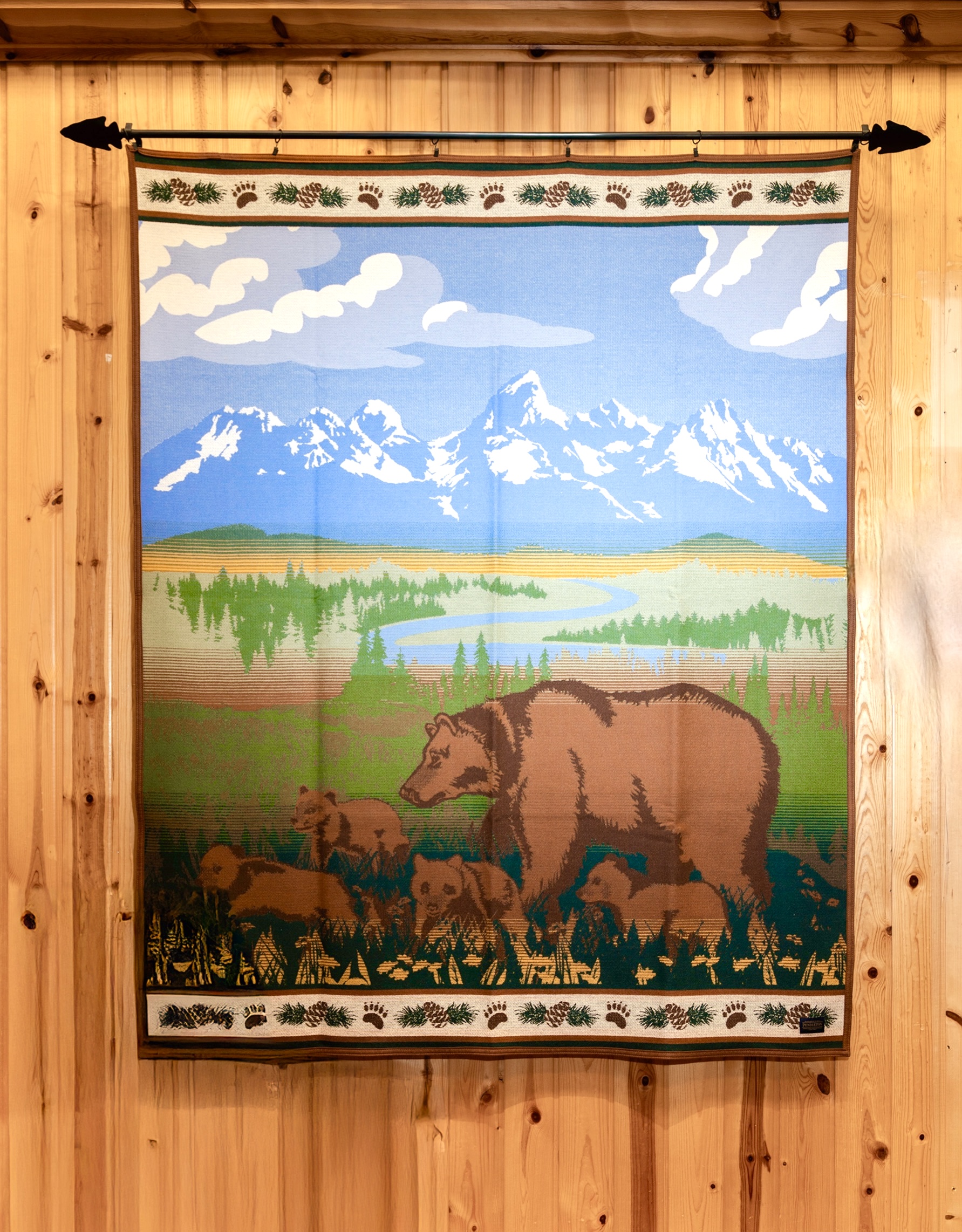 Now, the iconic Pendleton Woolen Mills is commemorating Grizzly 399 with a new blanket designed by Jackson Hole Pendleton owner, Charles Wright in collaboration with a local graphic artist. Crafted with trademark quality, this blanket is 64 by 80 inches and is woven with pure virgin wool and cotton. The design captures the beauty of the untamed wilderness and Grand Teton National Park, highlighting the deep connection between people and the wilderness.