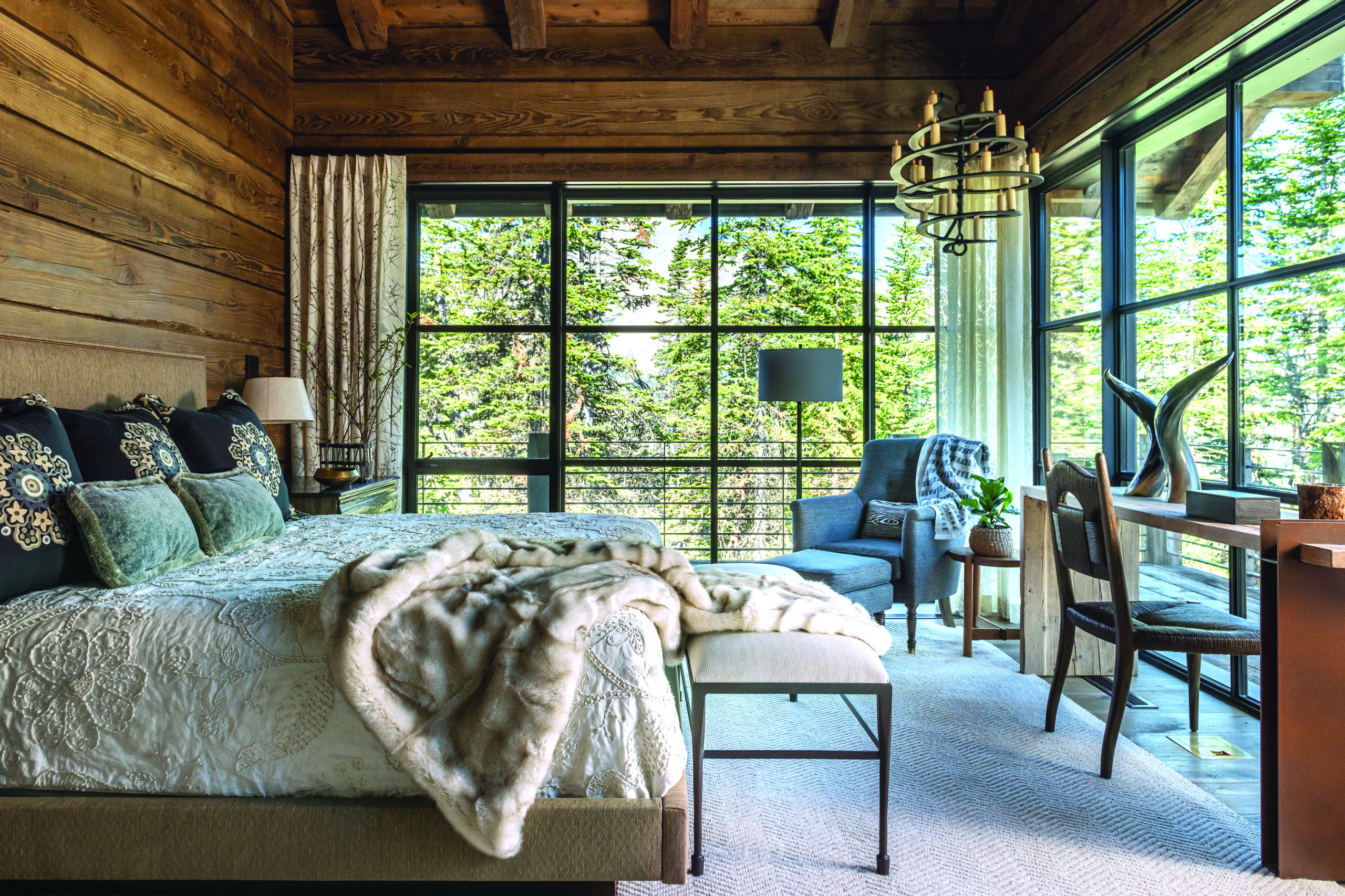 Barbara Eberlein designed a modern chalet in Big Sky, Montana, with warmth and comfort in mind. In the guest suite, she layers sumptuous pillows and throws, inviting guests to get comfortable and enjoy the views outside. EBERLEIN DESIGN CONSULTANTS . Philadelphia, Pennsylvania. | Audrey Hall