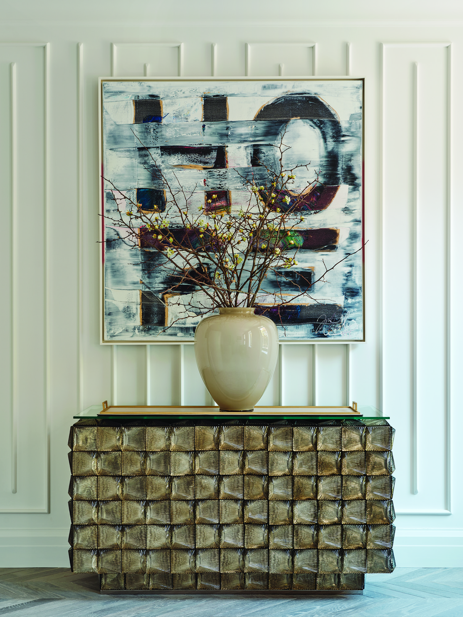 The French word insolite means rare, extraordinary. To Baird it’s an ethos. “We’re looking for one-off items that nobody else has,” she says. What could be more insolite than gold foil encased in glass, as in this Yves Klein “Monogold” coffee table. | Photo: Nick Sargent