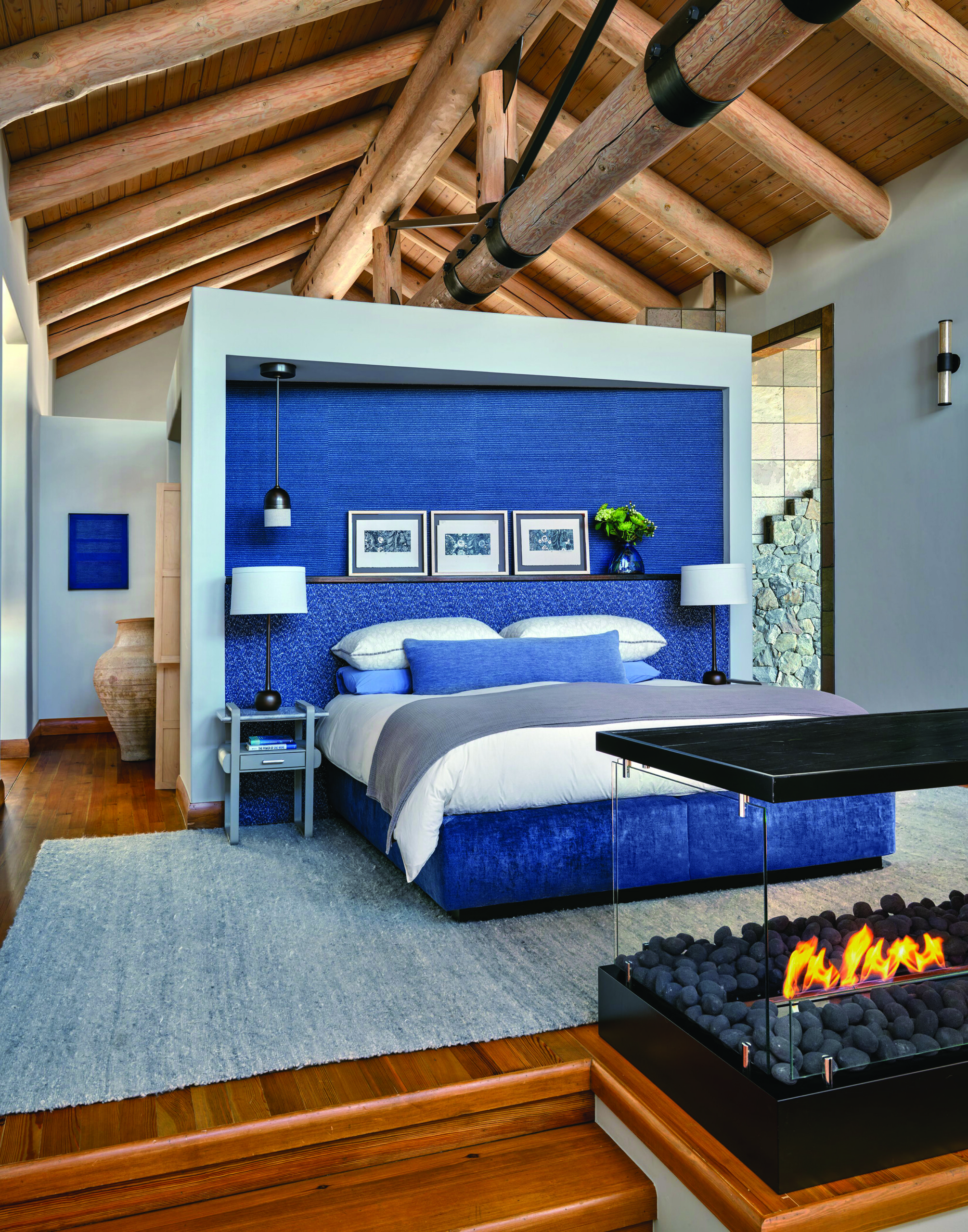 Baird’s design book features 12 projects, each as sumptuous as the last. In the “Mountain Magic” chapter, Baird shares a home she designed in Vail; shown here is its spacious main bedroom complete with freestanding fireplace. | Photo Trevor Tondro