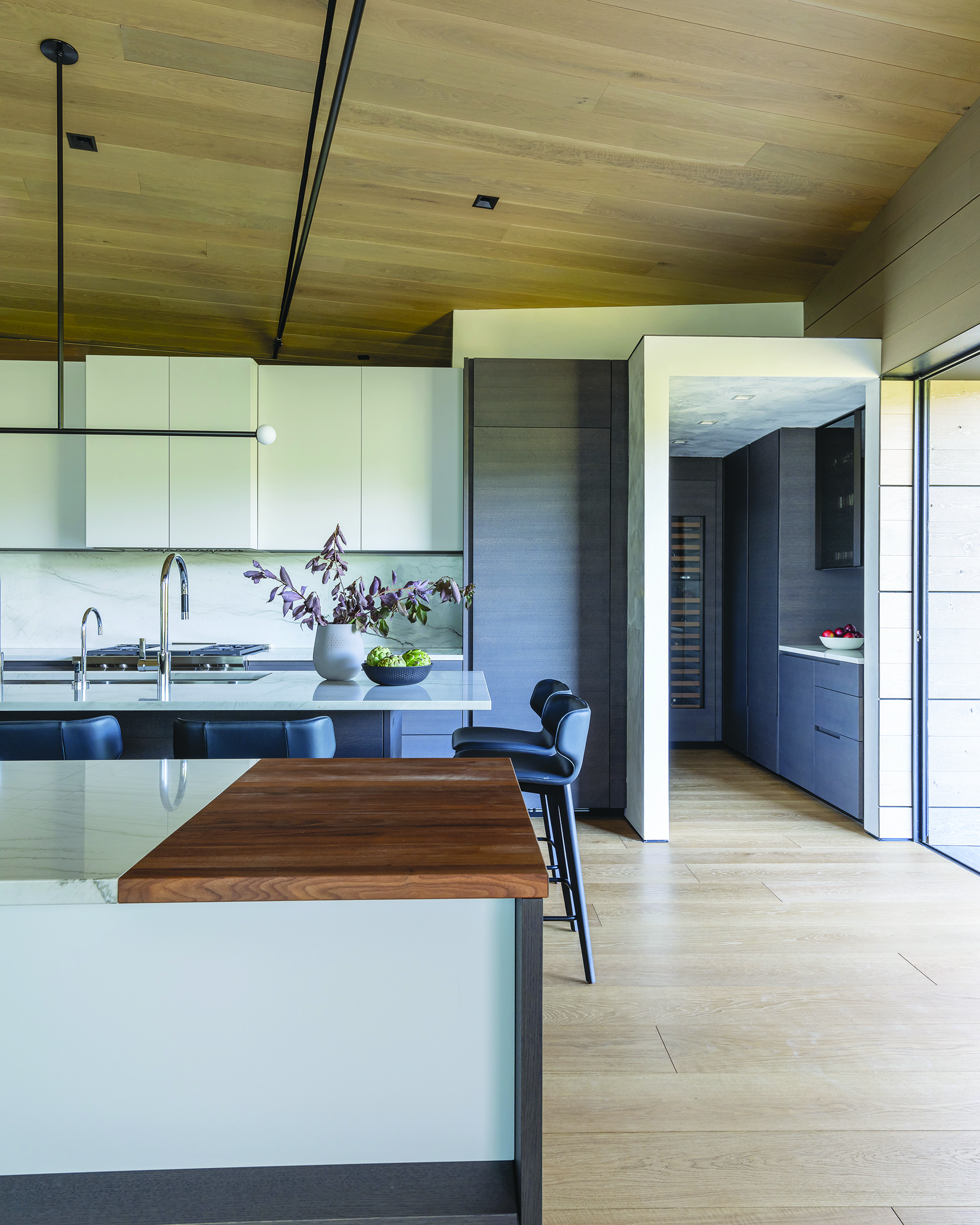 Design details reveal themselves gradually inside and outside the home—a slight shift, the hint of midcentury style and a restrained palette. “The home is formed to the site through architectural subtleties,” says Pearson, PDG’s founding principal.