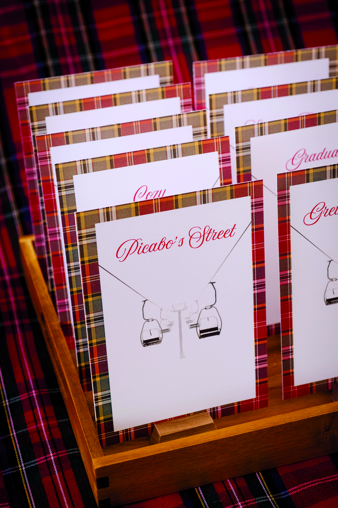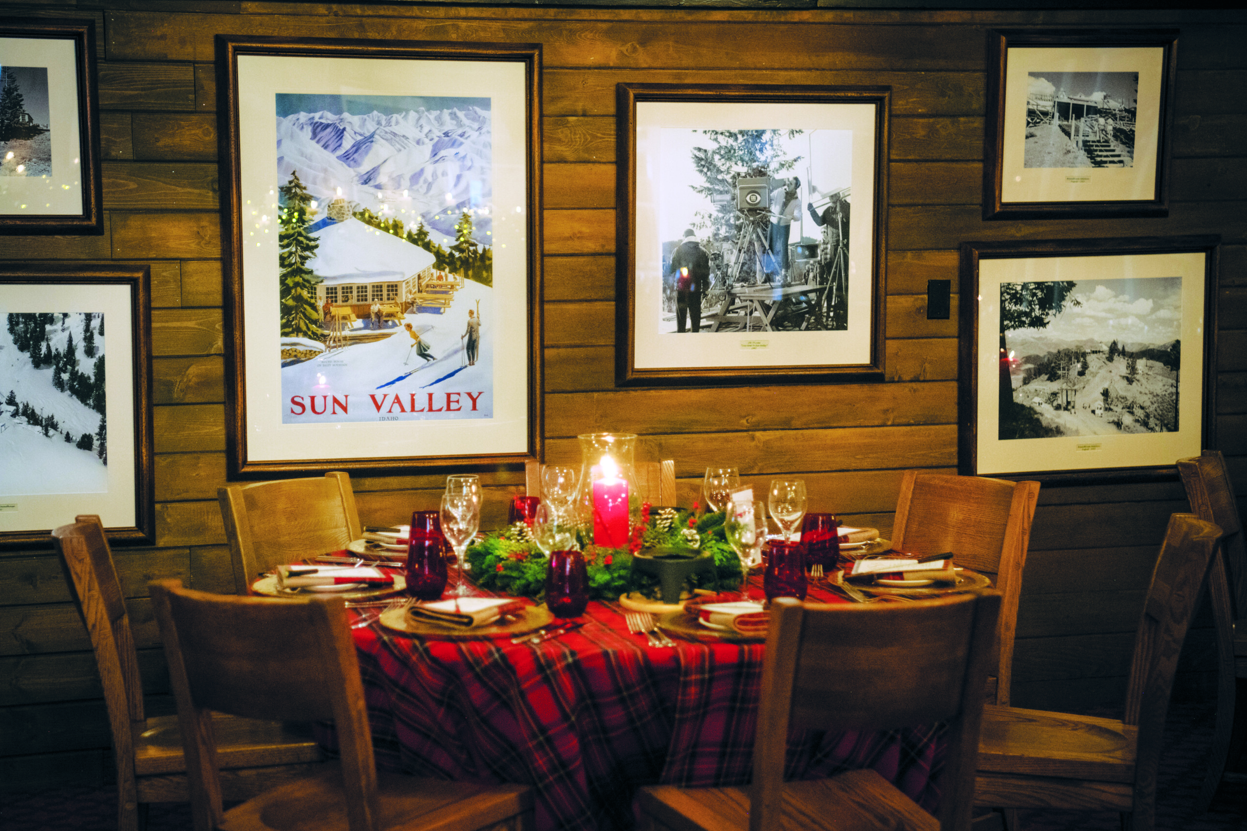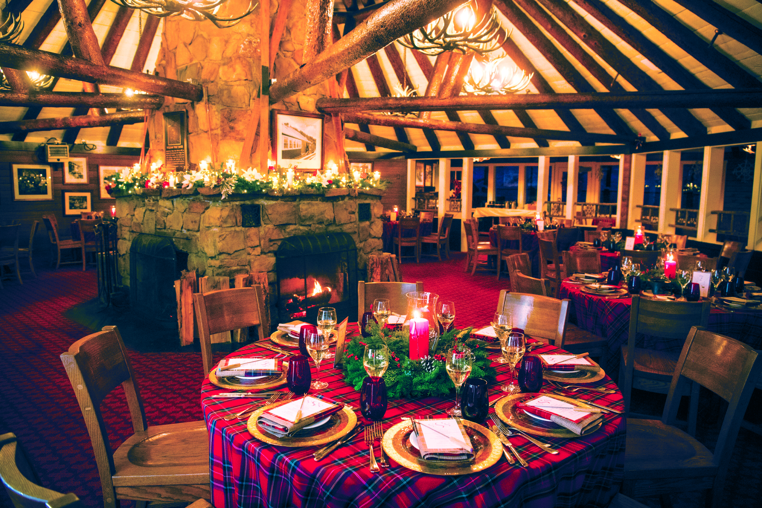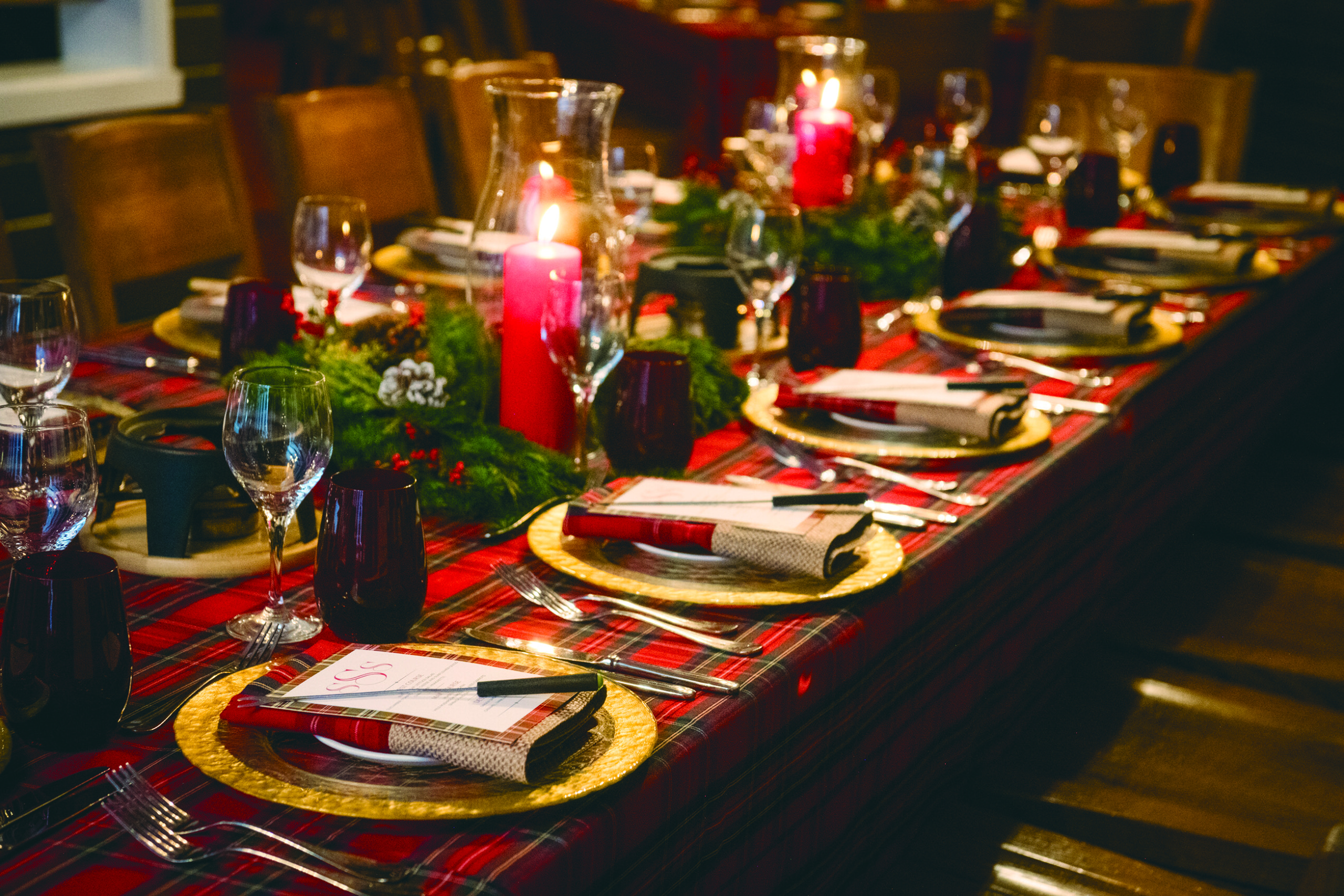 The printed designs, decor and menu vary each year. Last year’s event leaned classical, with red plaid tablecloths, gold-rimmed chargers, menu cards bordered in red plaid, red votives and water glasses, and greenery dotted with red berries. The robust aesthetic works well in the space, with its heavy log beams and vintage black-and-white photographs.