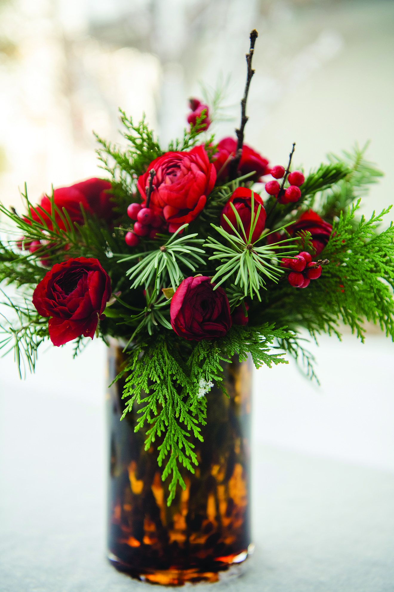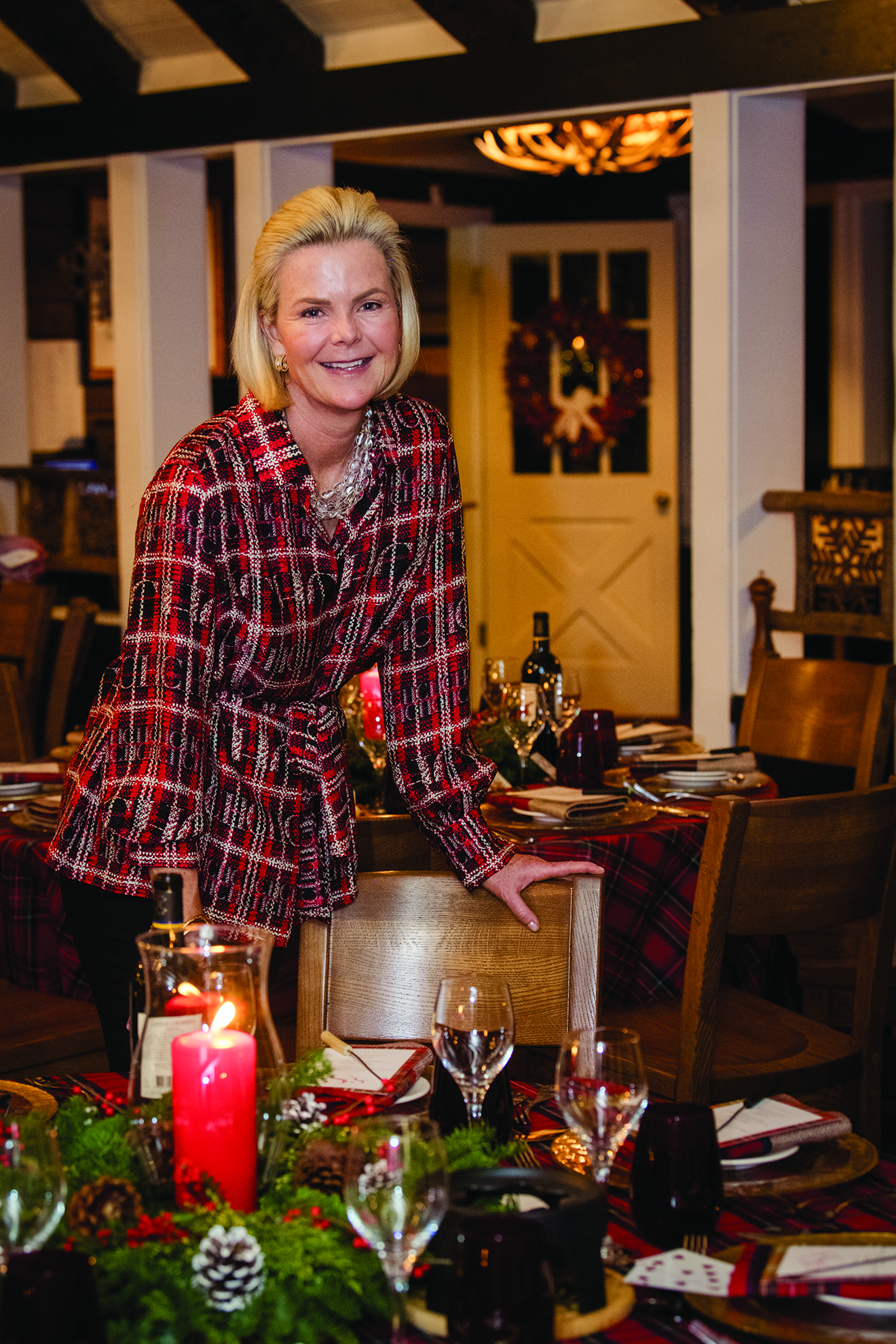 Table settings embrace a traditional holiday theme with cheerful plaid, red pillar candles and boughs of evergreen. Shafran works with Yellow House Floral to design the floral arrangements. | Photo: Dev Khalsa
