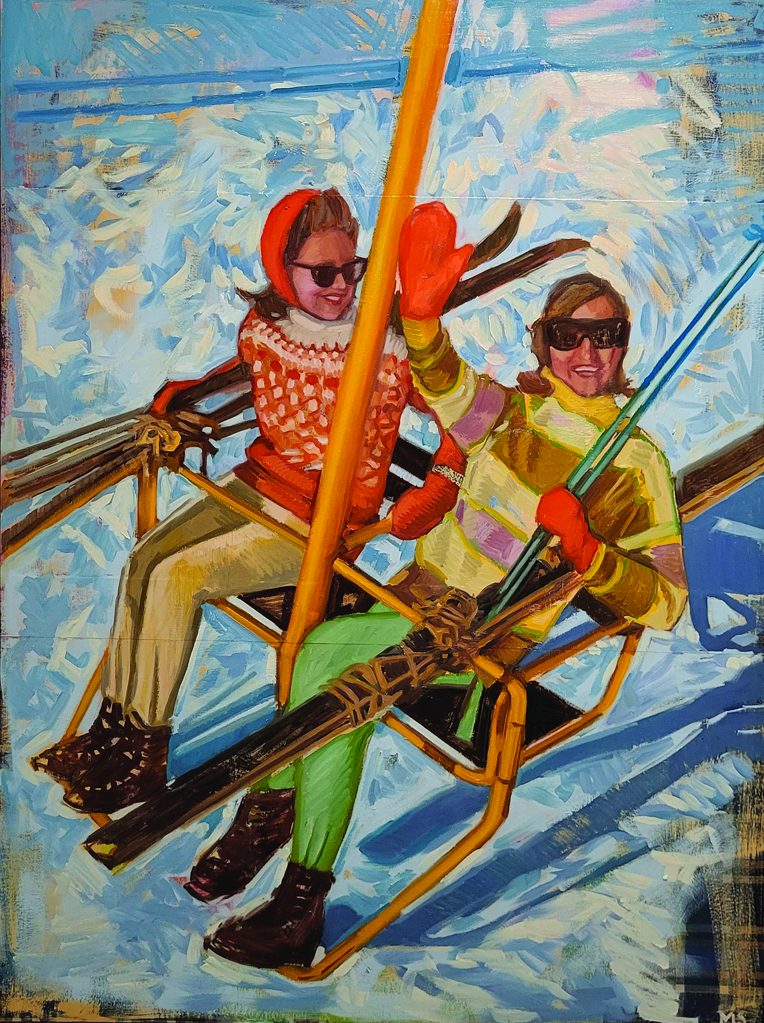 SUNNY SKI LIFT – MARY SINNER Mixed media on wood panel, 36 x 48 inches, meyergallery.com
