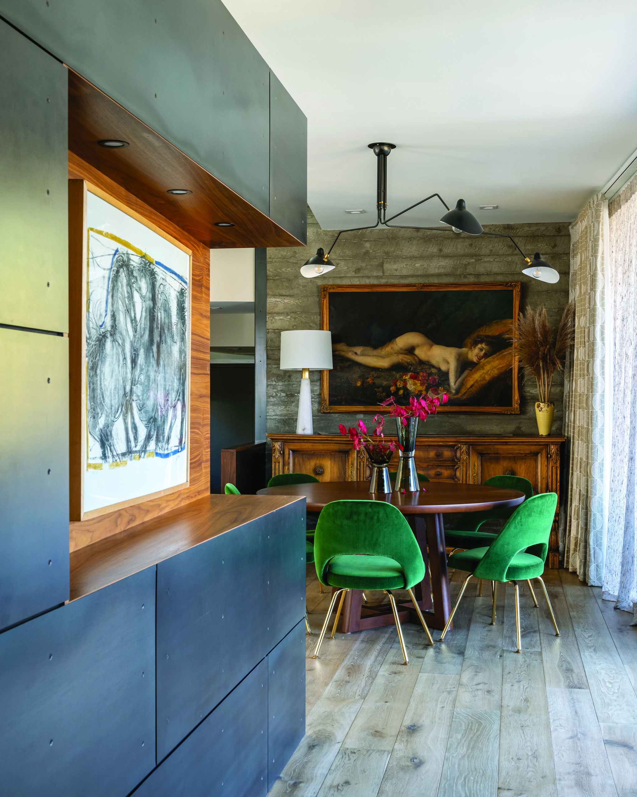 In the dining area, Envi Design hung a gilded-framed nude painting against a board-formed concrete wall and paired with emerald- green chairs for a bold look. | Photo: Audrey Hall