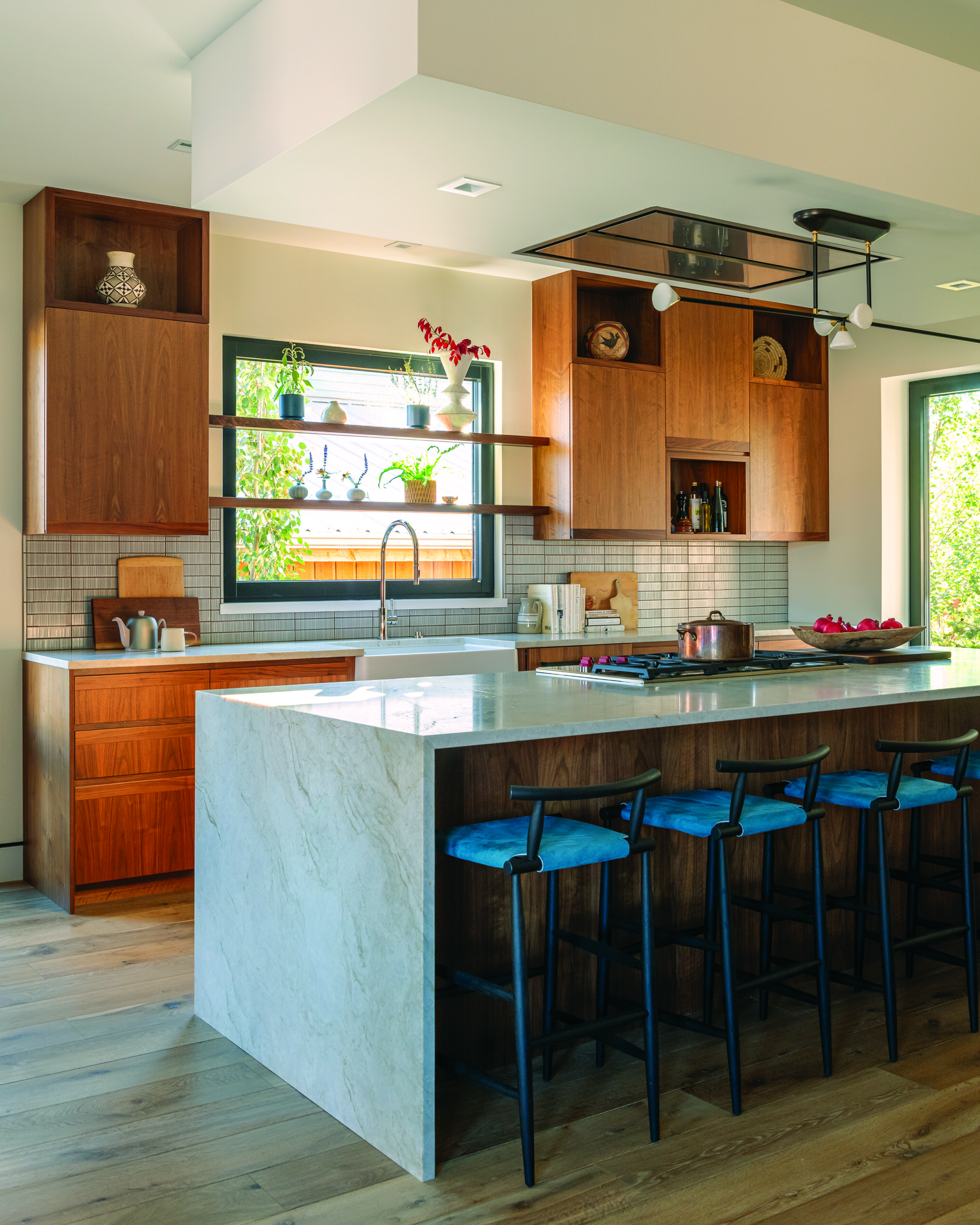 The light-filled kitchen features walnut cabinetry, Taj Mahal countertops, an Ann Sacks Savoy ribbed-tile backsplash, Roll and Hill light fixture and Miniforms barstools. | Photo: Audrey Hall